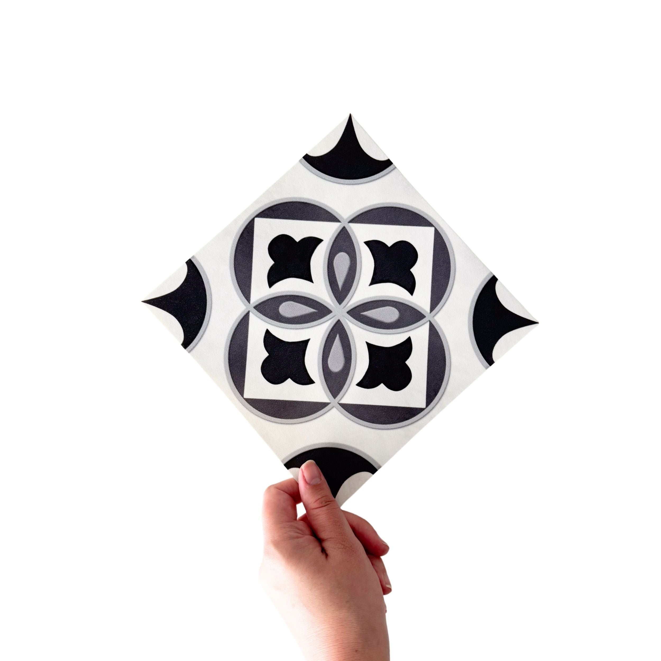Clara grå er en selvklebende flis med historisk design i mørk, lys og mellomgrå. Flisen kommer i dempet farger med en nøytral undertone.