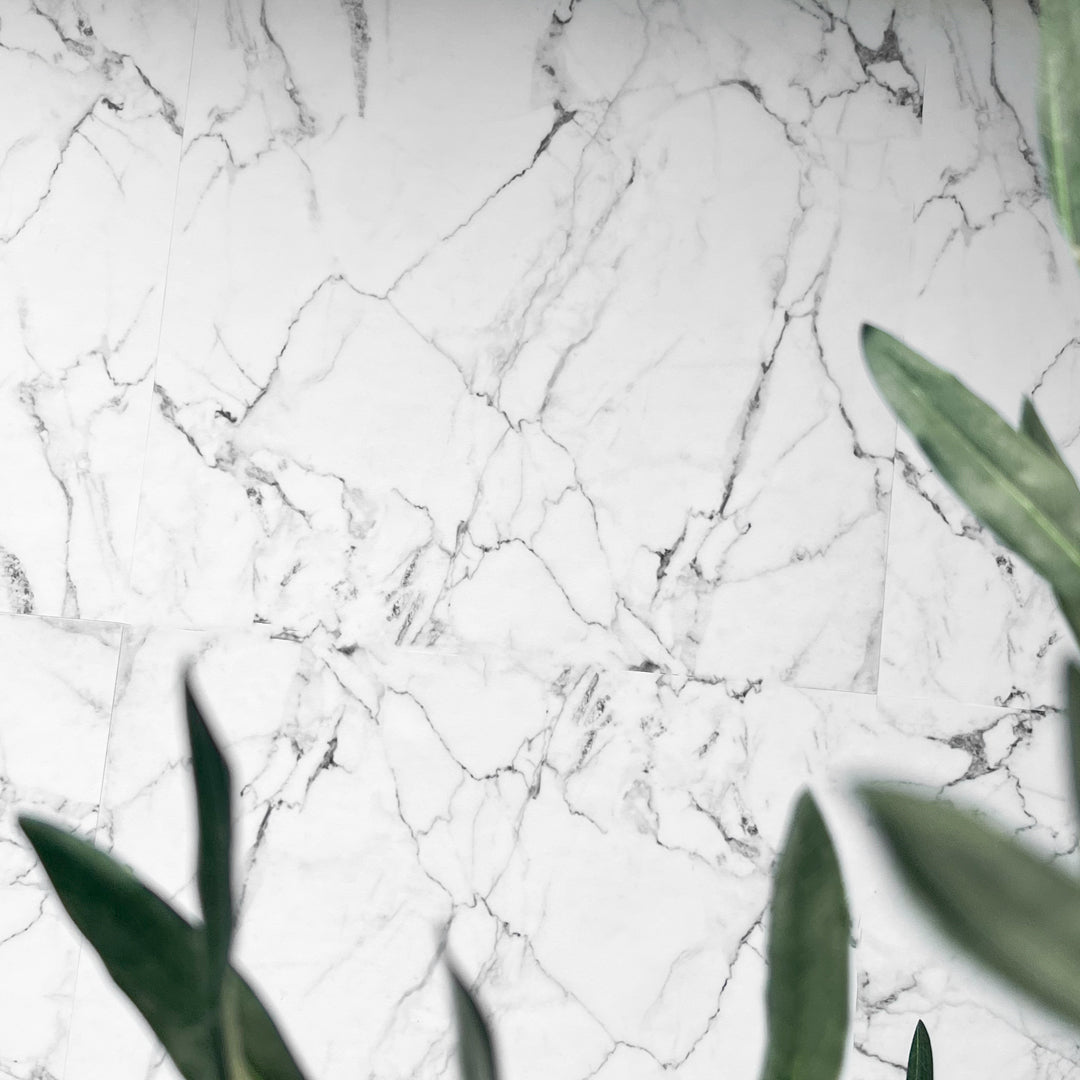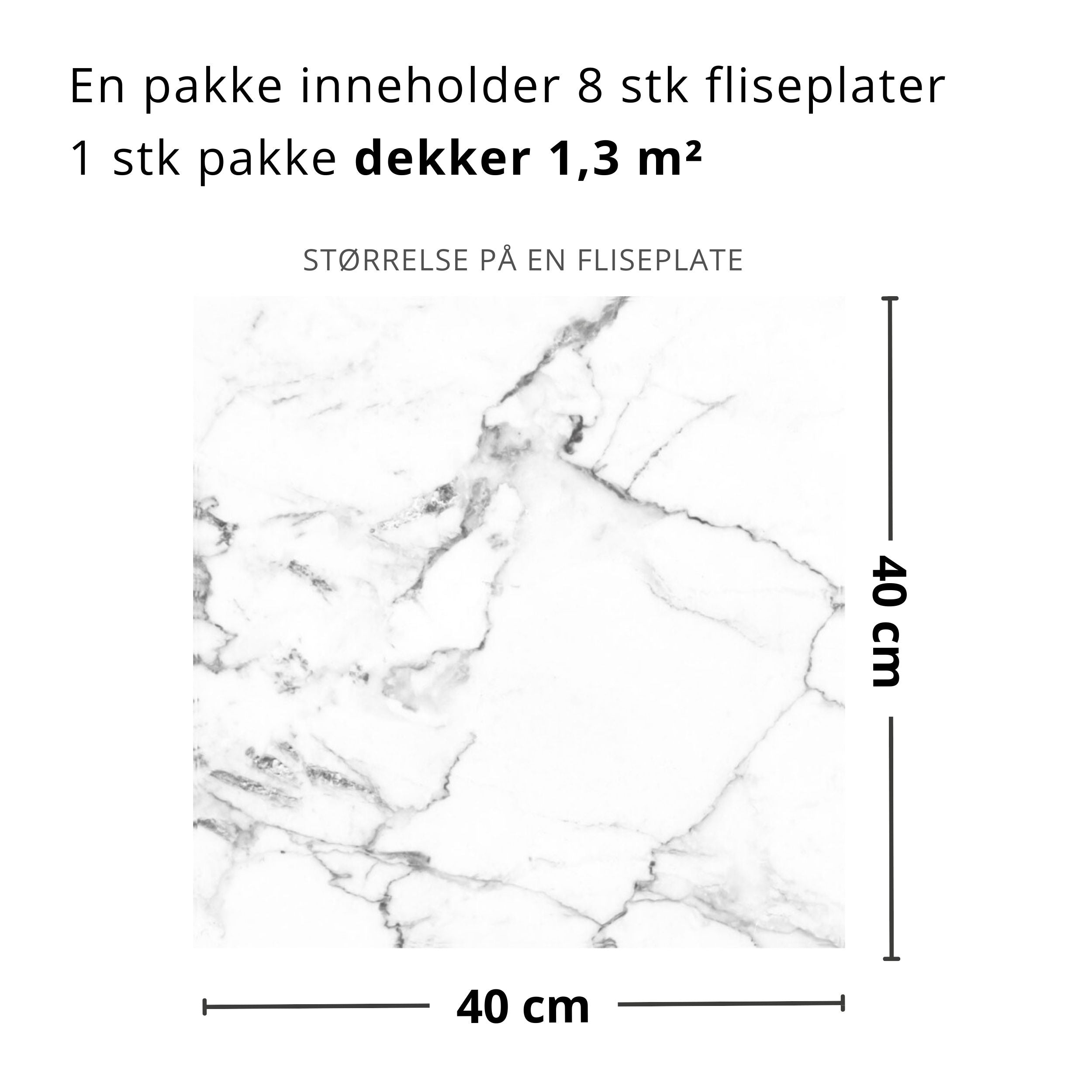 Nikoline marmor er selvklebende fliser med hvit bakgrunn og sortgrå marmorering, med grønn undertone. Pakken kommer med 8 identiske fliser, for å få mer variasjon i designet kan flisene vendes.