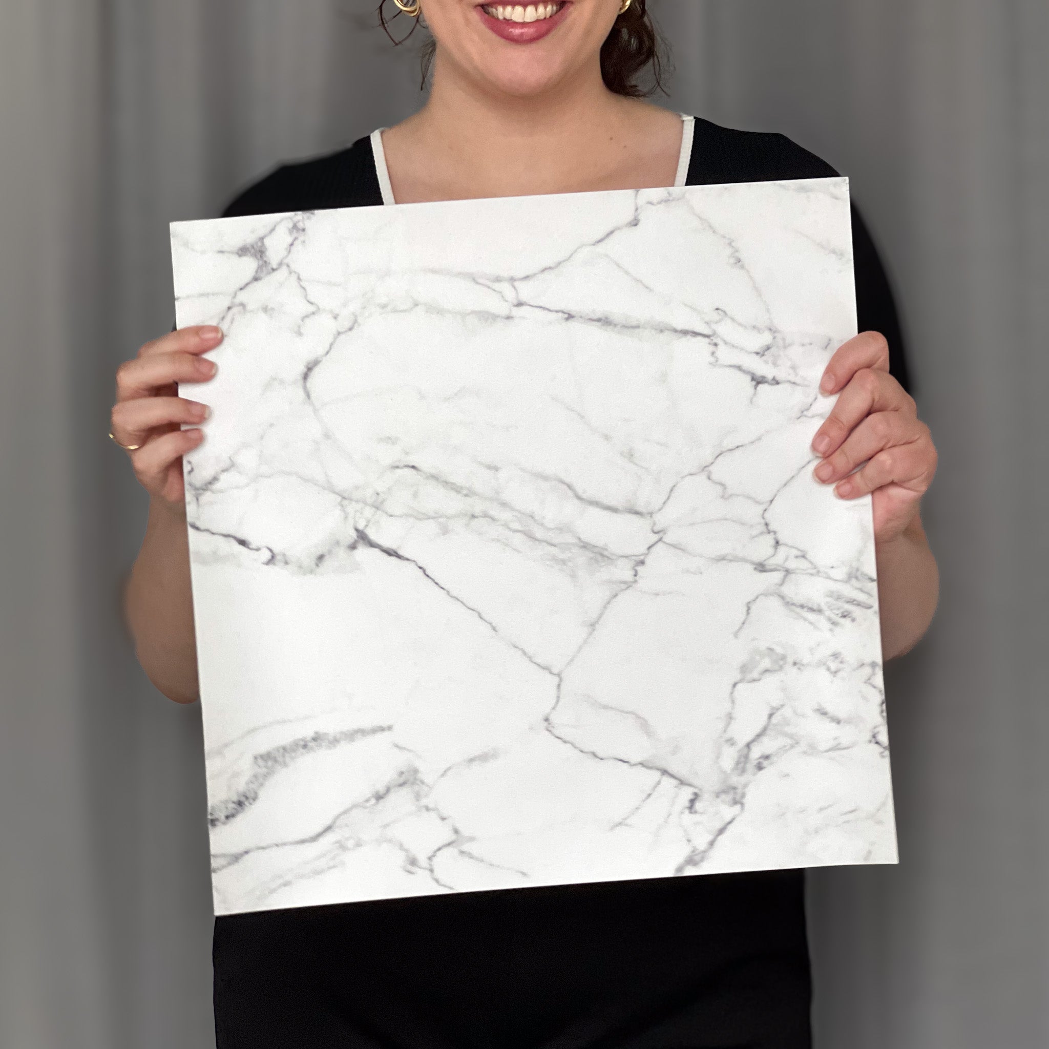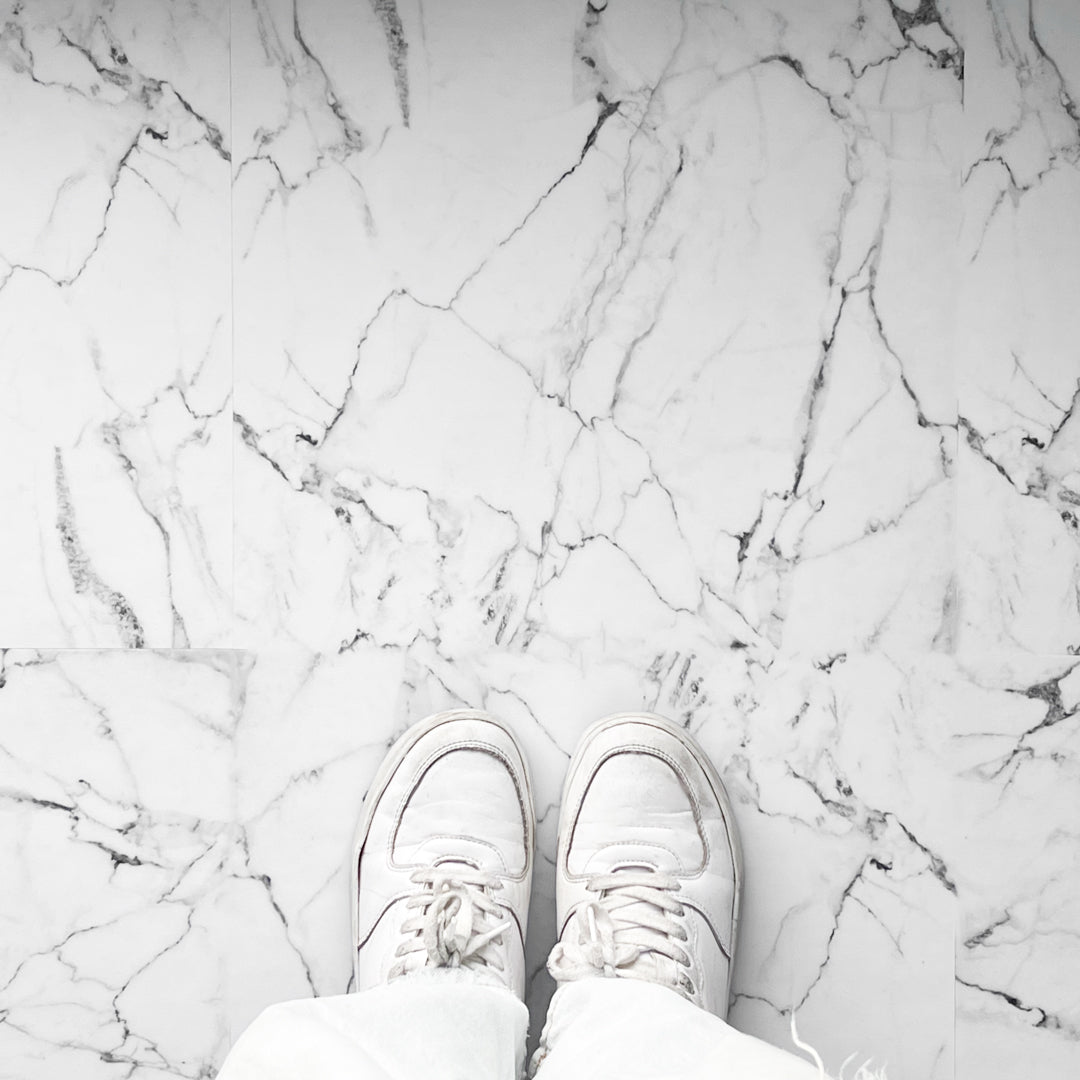 Nikoline marmor selvklebende fliser imiterer marmor med grå toner. Den gir et luksuriøst og elegant uttrykk. Passer godt til alle gulv og kjøkken.