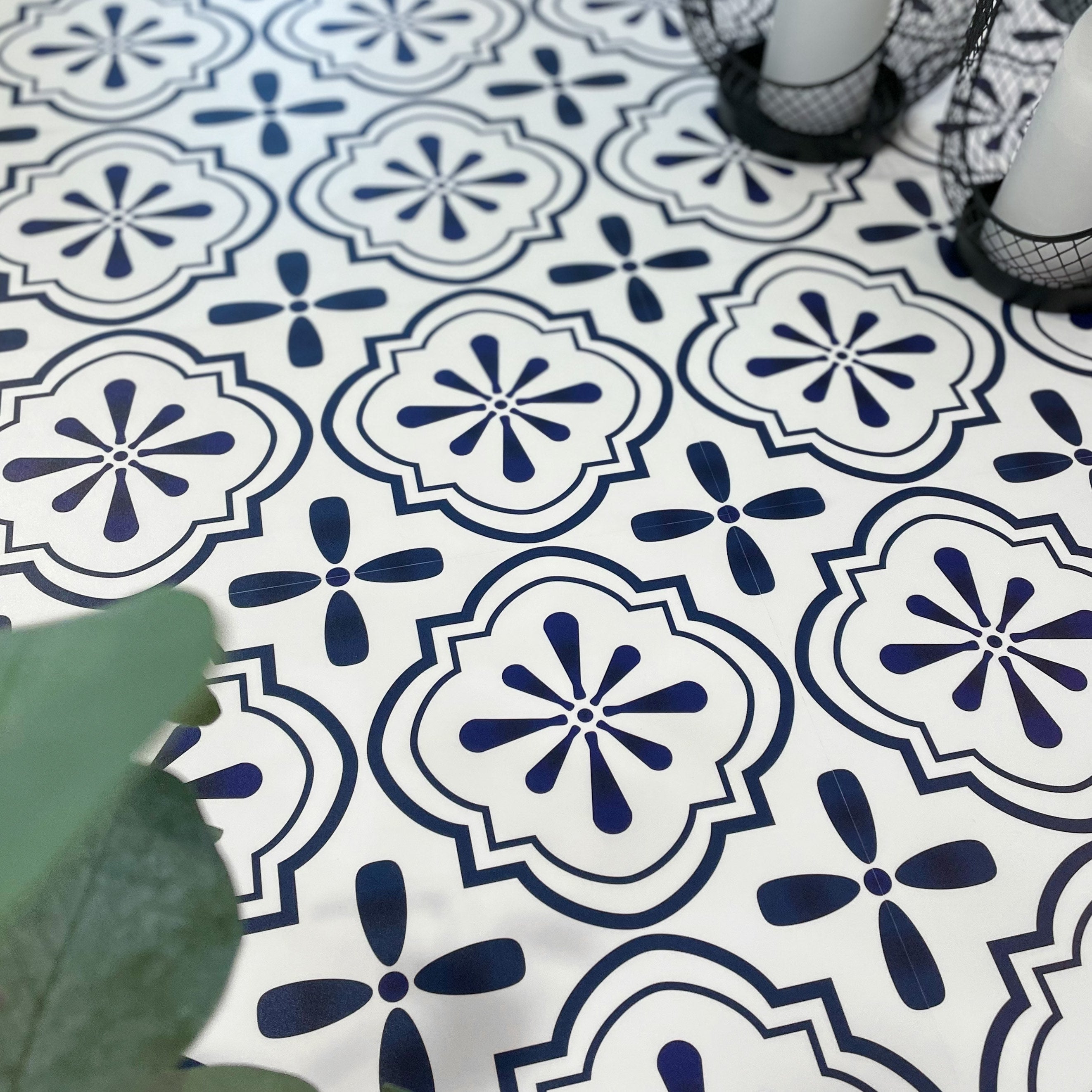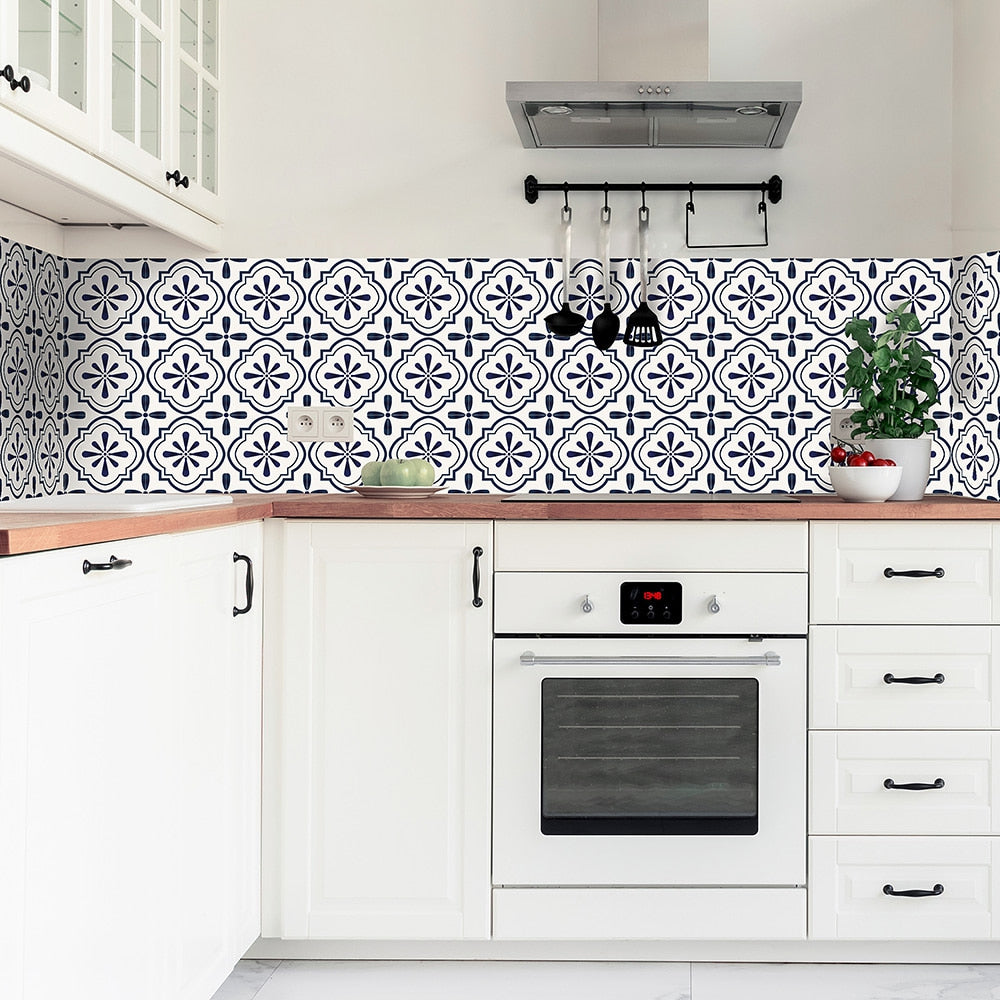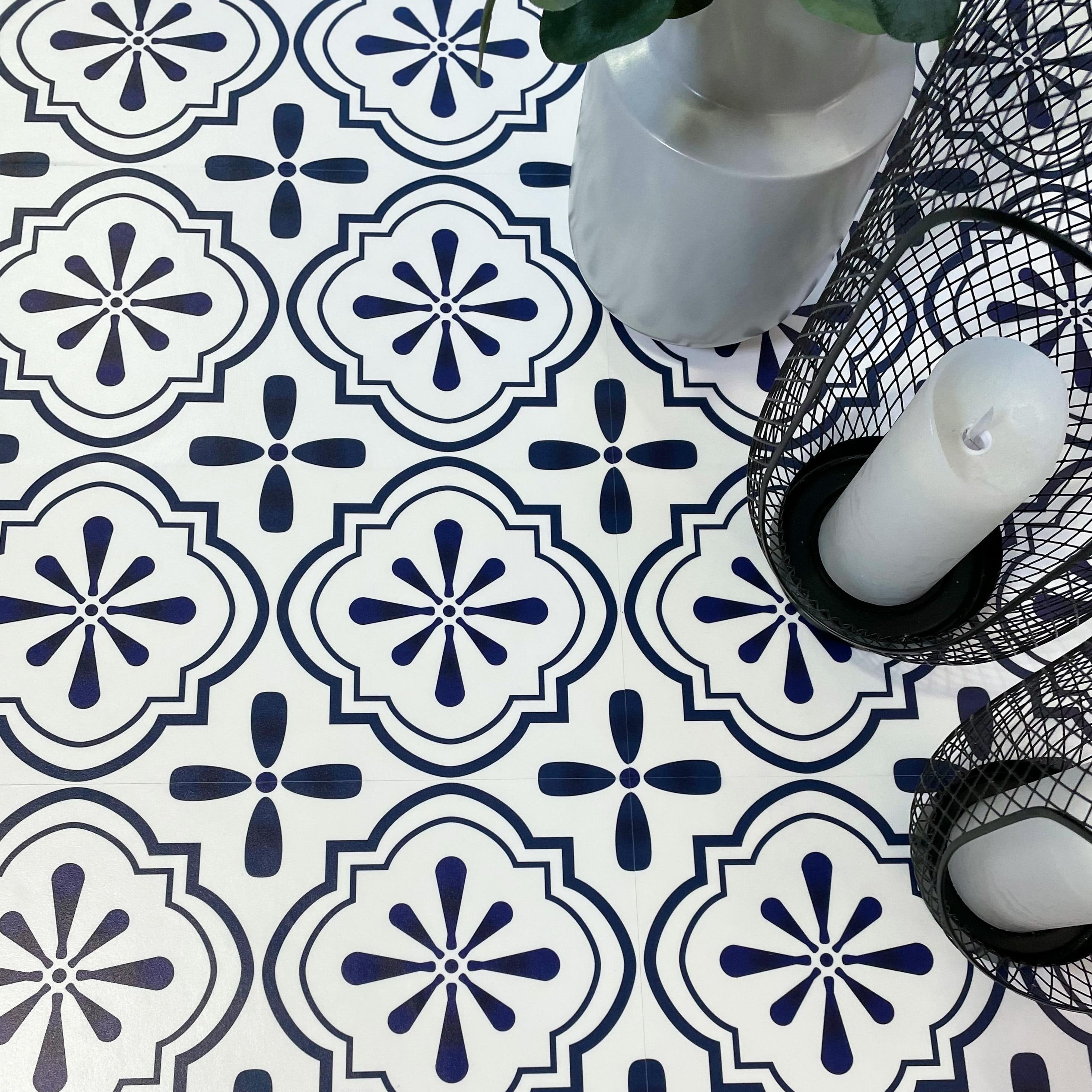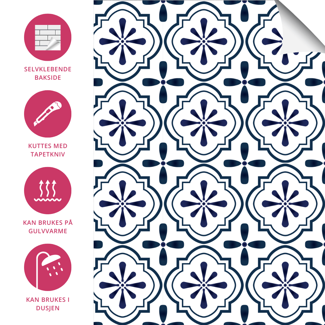 Nova blå selvklebende fliser har et nydelig historisk design som passer perfekt inn i hjemmet. Flisene har et flott historisk mønster i hvit og mørk blå, og ser like fine ut på gulv som på vegg.