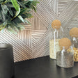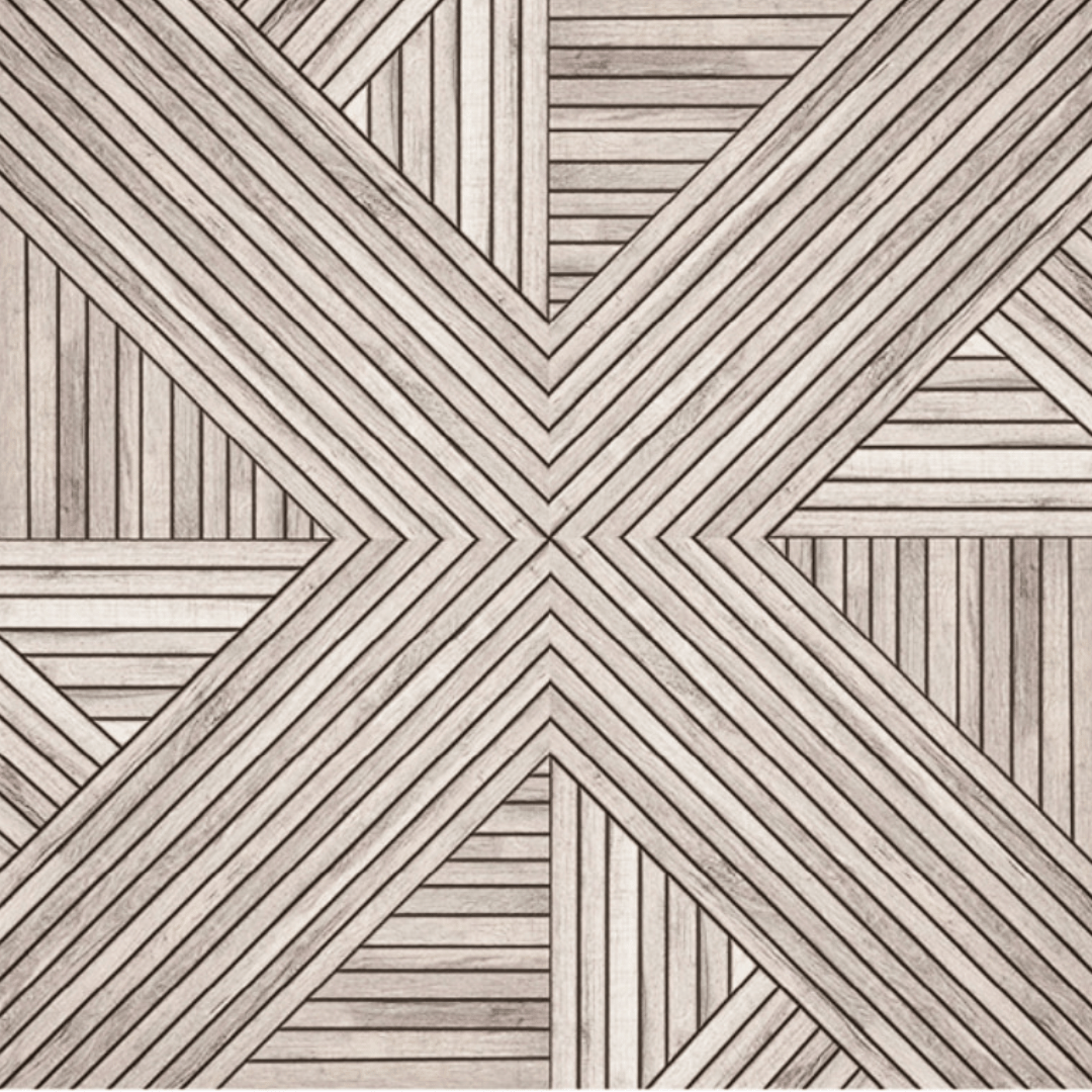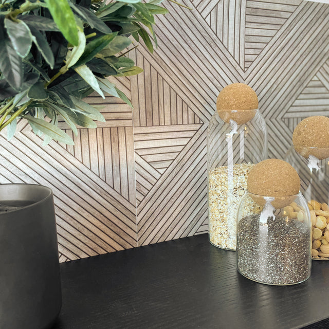 Oda selvklebende fliser kombinerer moderne geometri med det naturlige uttrykket til spilepaneler. Flisene har et unikt design som etterligner tynne spiler arrangert i spennende, symmetriske mønstre.
