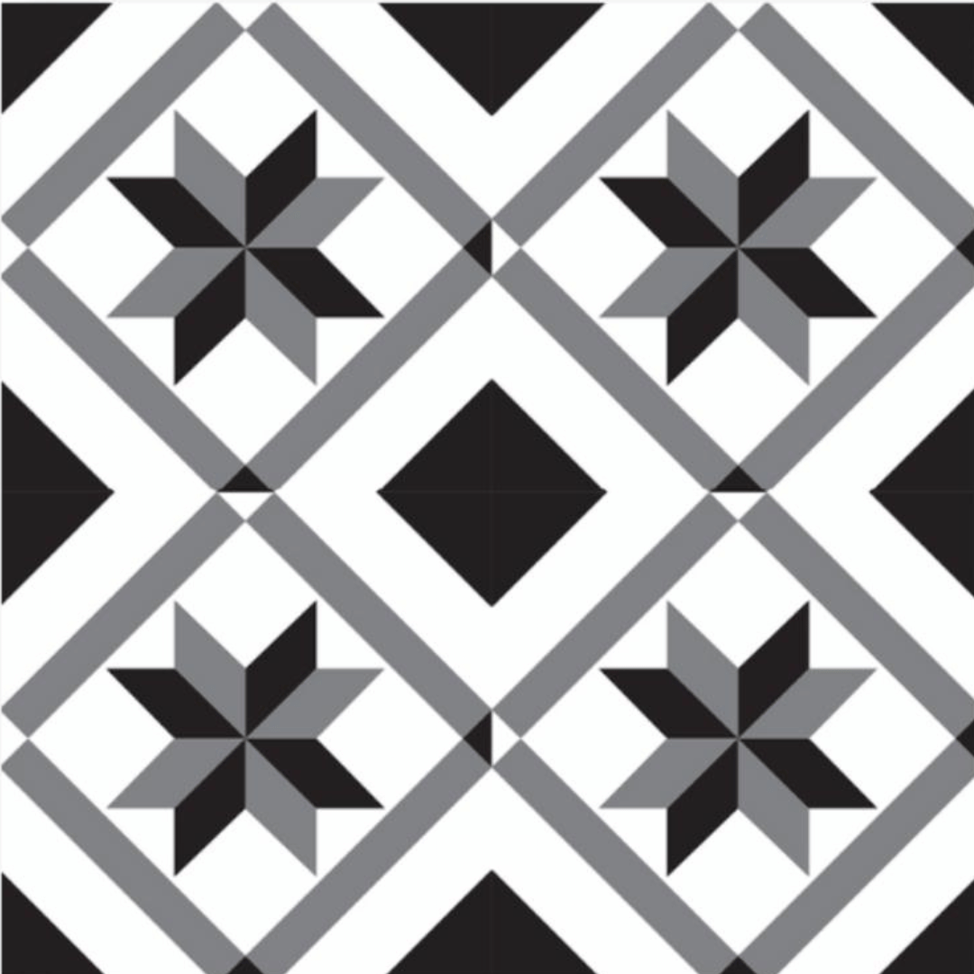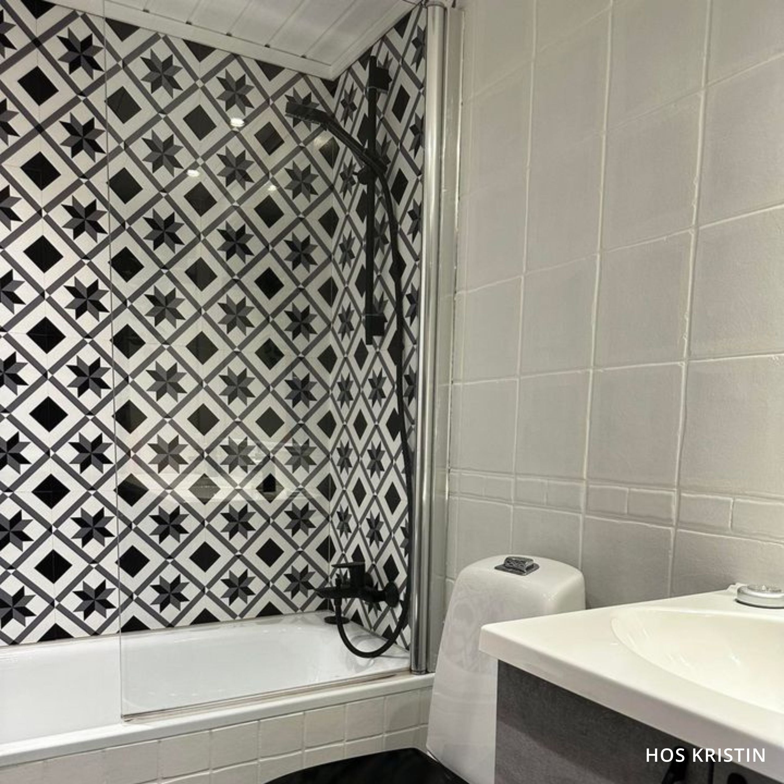 Oslo selvklebende fliser har et historisk design med stjerner og rette linjer i sort, hvit og grå. Perfekt til gang, bad og vegg.