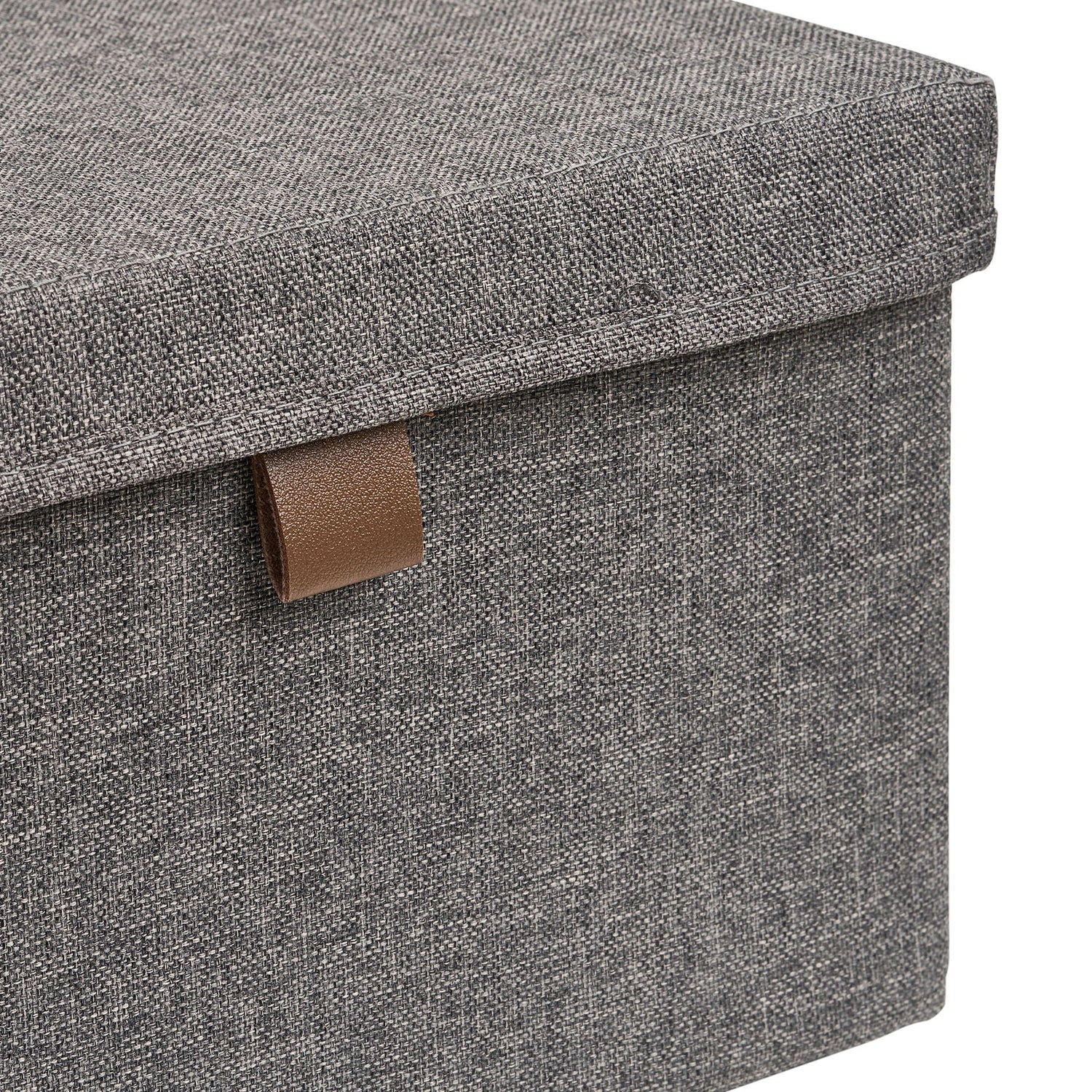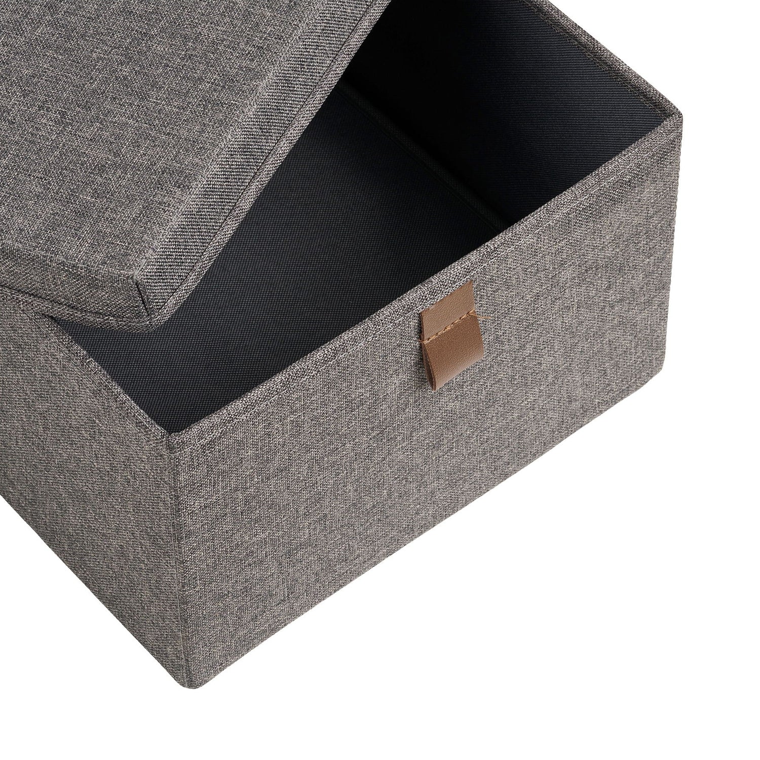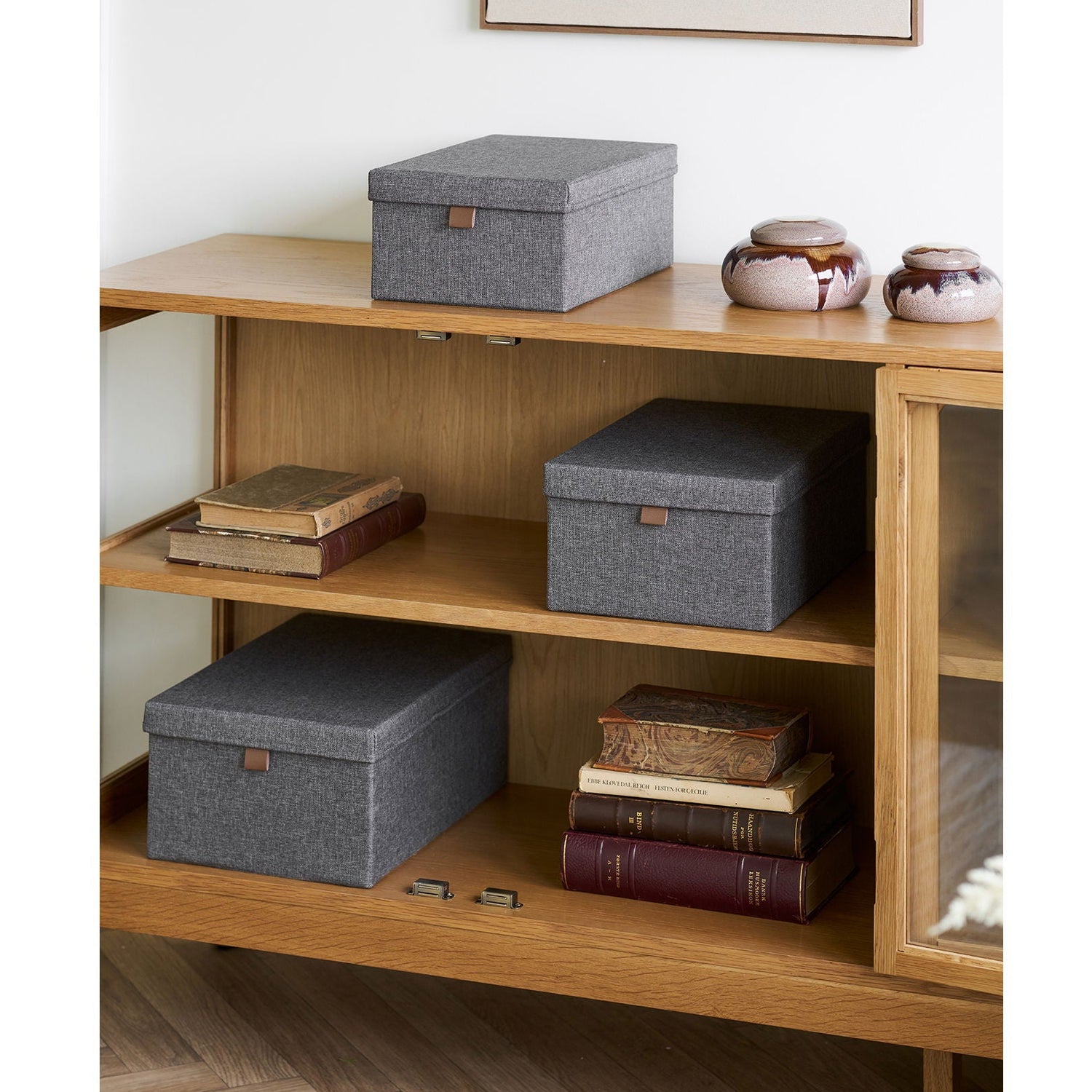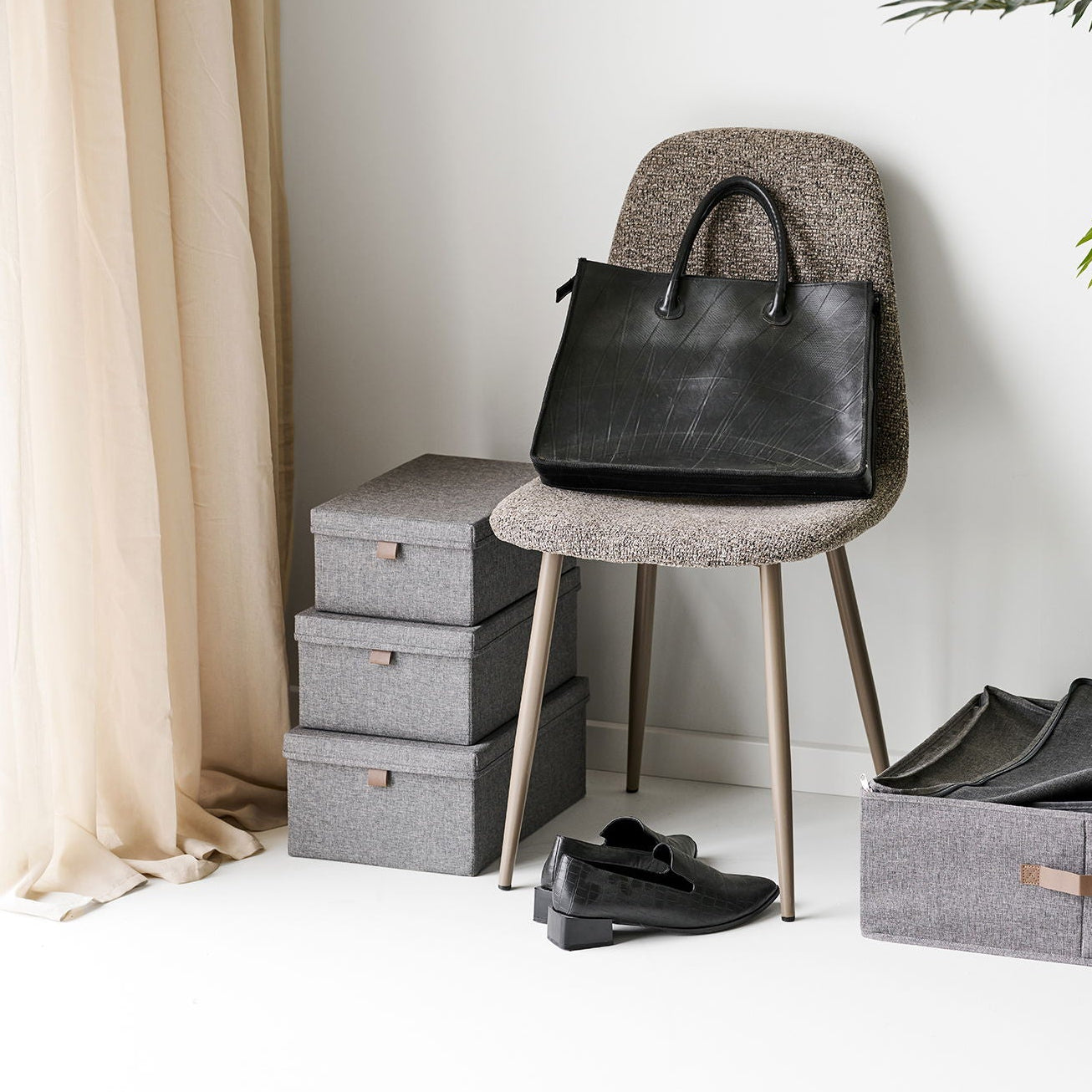 Kurvene er trukket i slitesterk polyester i mørk grå nyanse og har lokk som beskytter innholdet mot støv. Håndtakene i PU gjør dem enkle å trekke ut fra reol eller garderobe.