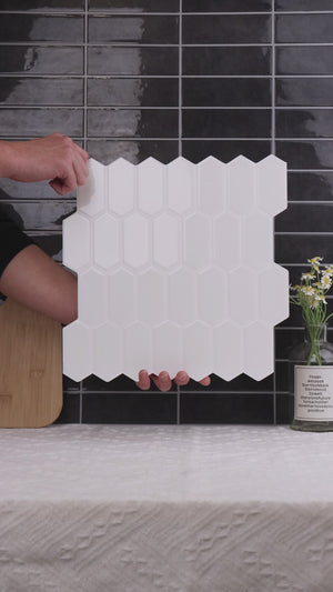 Alexandra Hvit er en selvklebende veggflis med myk og glatt overflate.