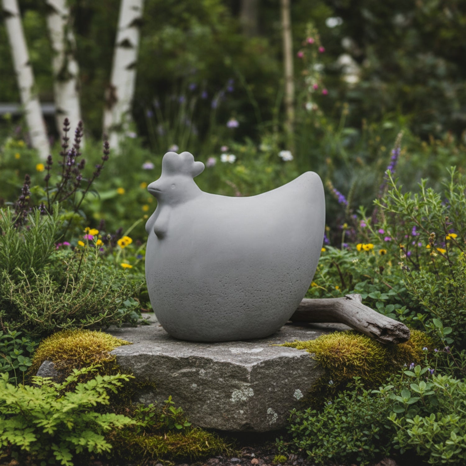 Concrete hen fra det svenske merkenavnet DBKD. Den er laget i solid betong med en matt grå overflate som gir tyngde, stabilitet og en eksklusiv følelse i hånden. Med diameter 19 x 13 cm og høyde 18 cm skaper den et naturlig blikkfang i hagen eller på terrassen.