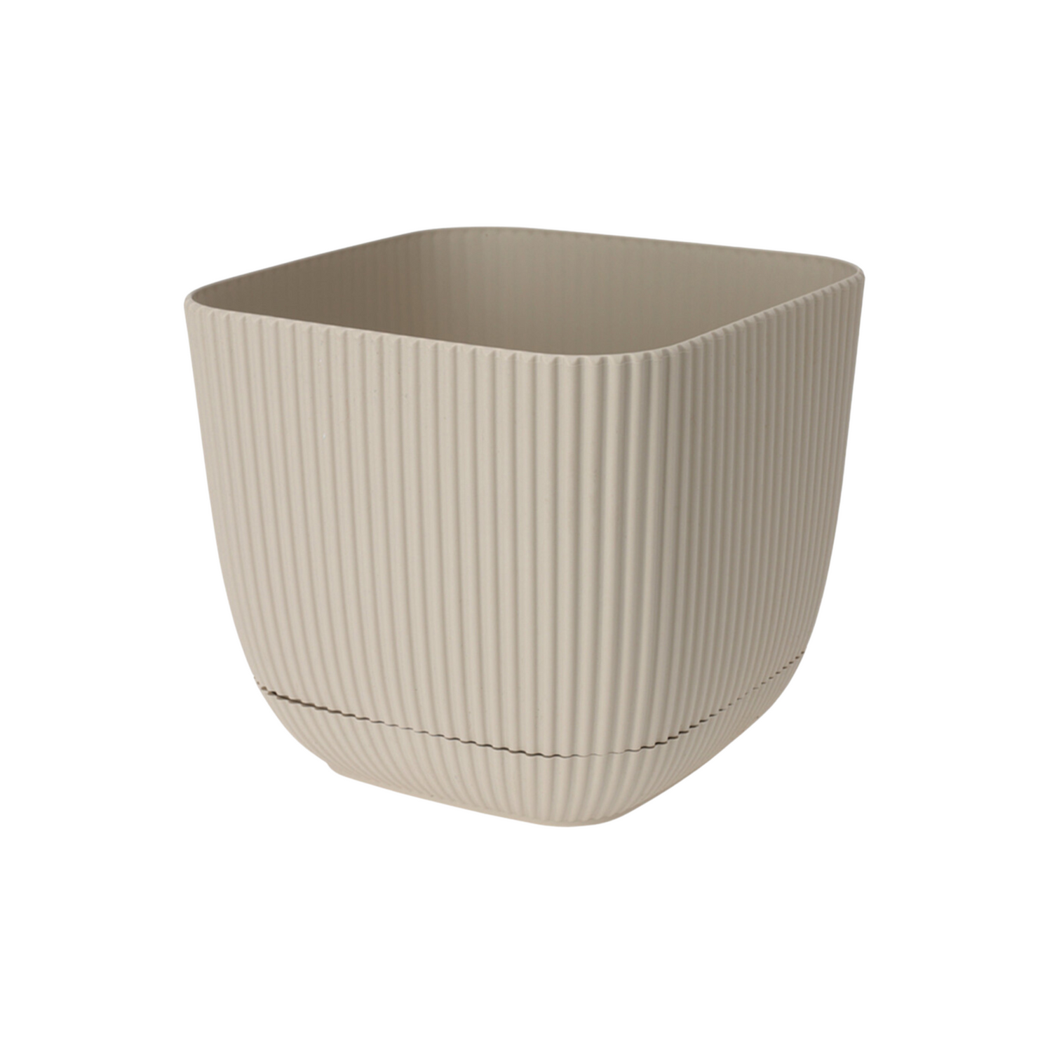 Potten har et moderne, rillet design og en myk, matt overflate som passer perfekt inn i både klassiske og minimalistiske interiørstiler. Den er laget i slitesterk plast og kommer med en integrert skål i bunnen for å fange opp overflødig vann, praktisk for både inne og utebruk.