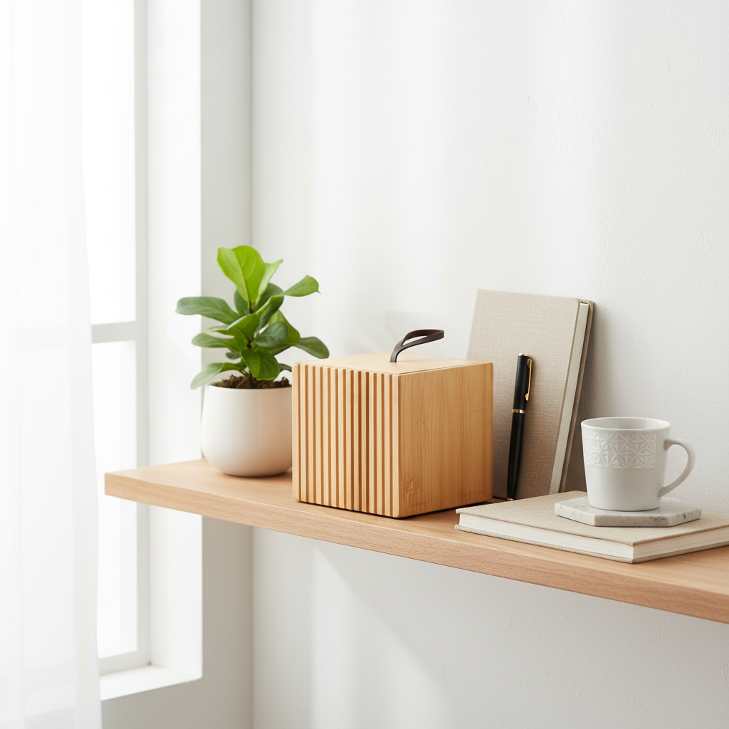 Liten, men smart. Denne bambusboksen på 9 x 9 cm er perfekt til smykker, nøkler, kontorklips eller andre småting som har en tendens til å forsvinne. FSC-sertifisert bambus med skinnstropp som håndtak.
