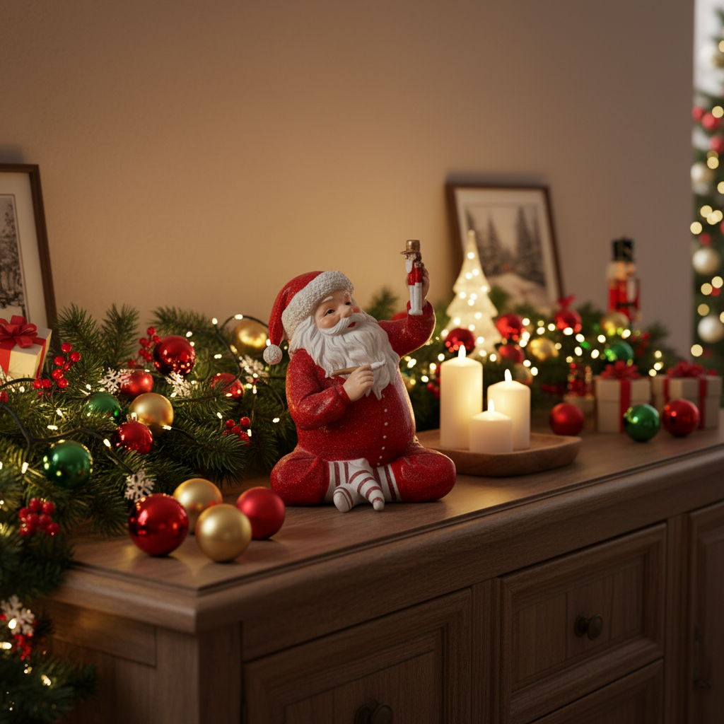Skap en varm og koselig julestemning med denne sjarmerende nissefiguren. Figuren viser en sittende nisse i glitrende rød drakt som holder en liten gullfigur i hånden. Med sitt detaljerte design og klassiske uttrykk er den perfekt som julepynt på bord, hylle eller i vinduskarmen.