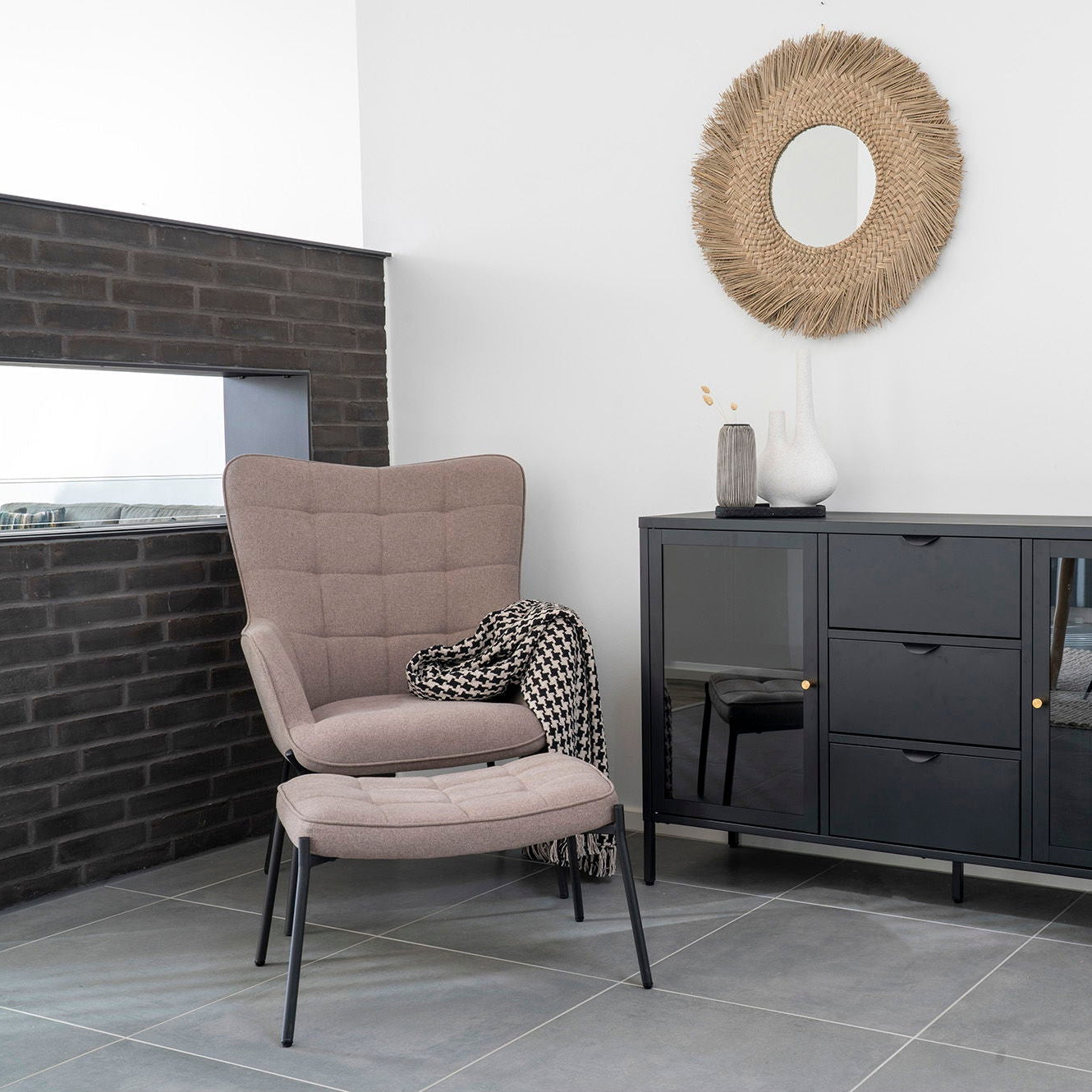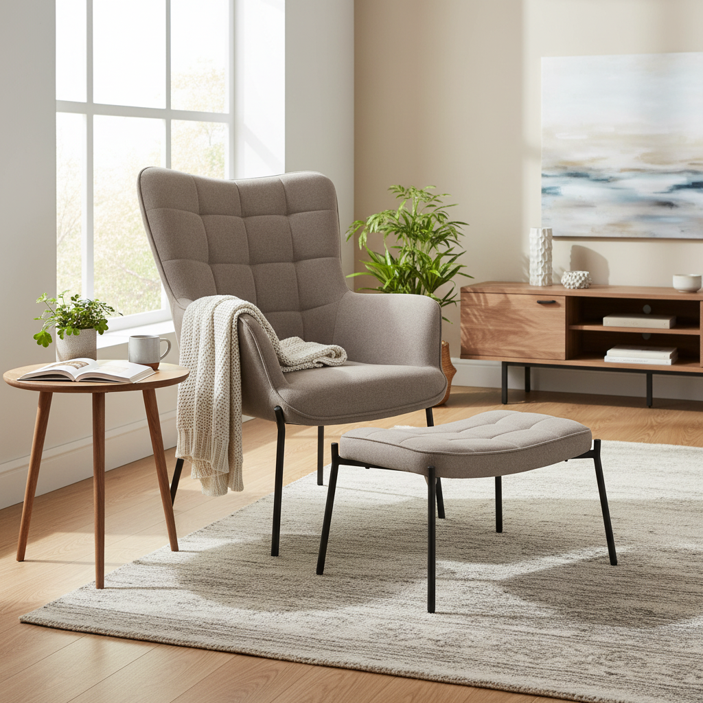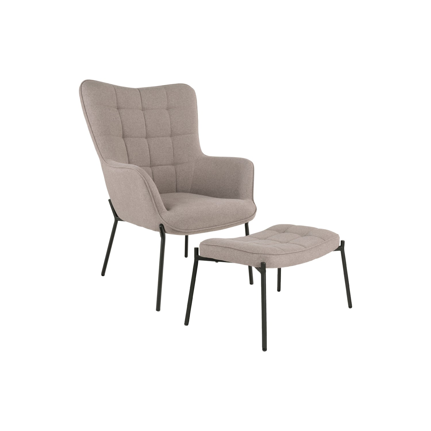 Den høye ryggen og de omsluttende sidene gir stolen en behagelig og lun sittefølelse, mens den tilhørende fotskammelen gjør det enkelt å sitte mer avslappet. Kombinasjonen av den dempede stone fargen, quiltede detaljer og slanke sorte ben gir settet et elegant og moderne uttrykk. Du får et møbelsett som både fungerer som en komfortabel hvilestol og som et dekorativt blikkfang i rommet.