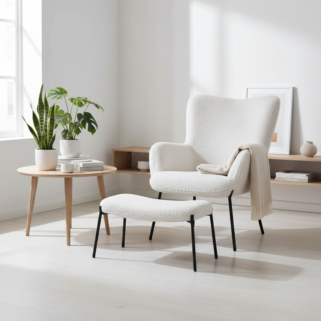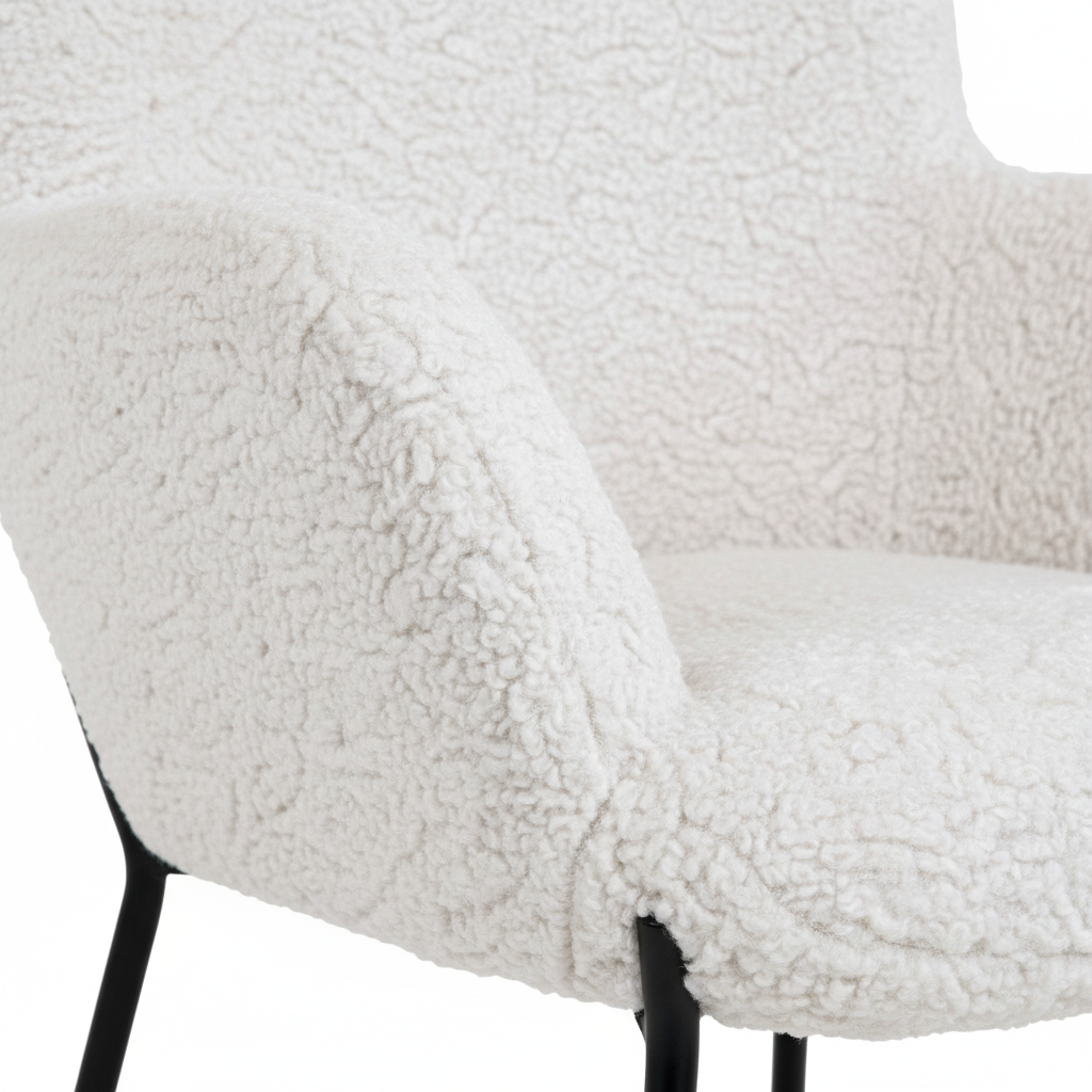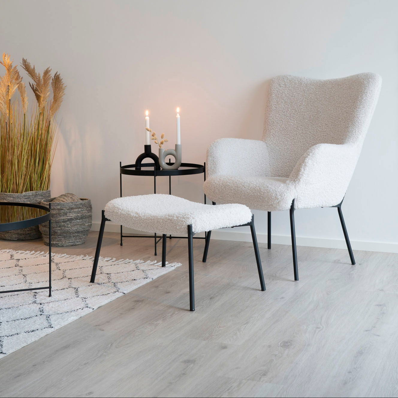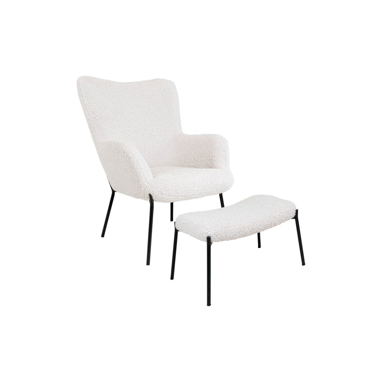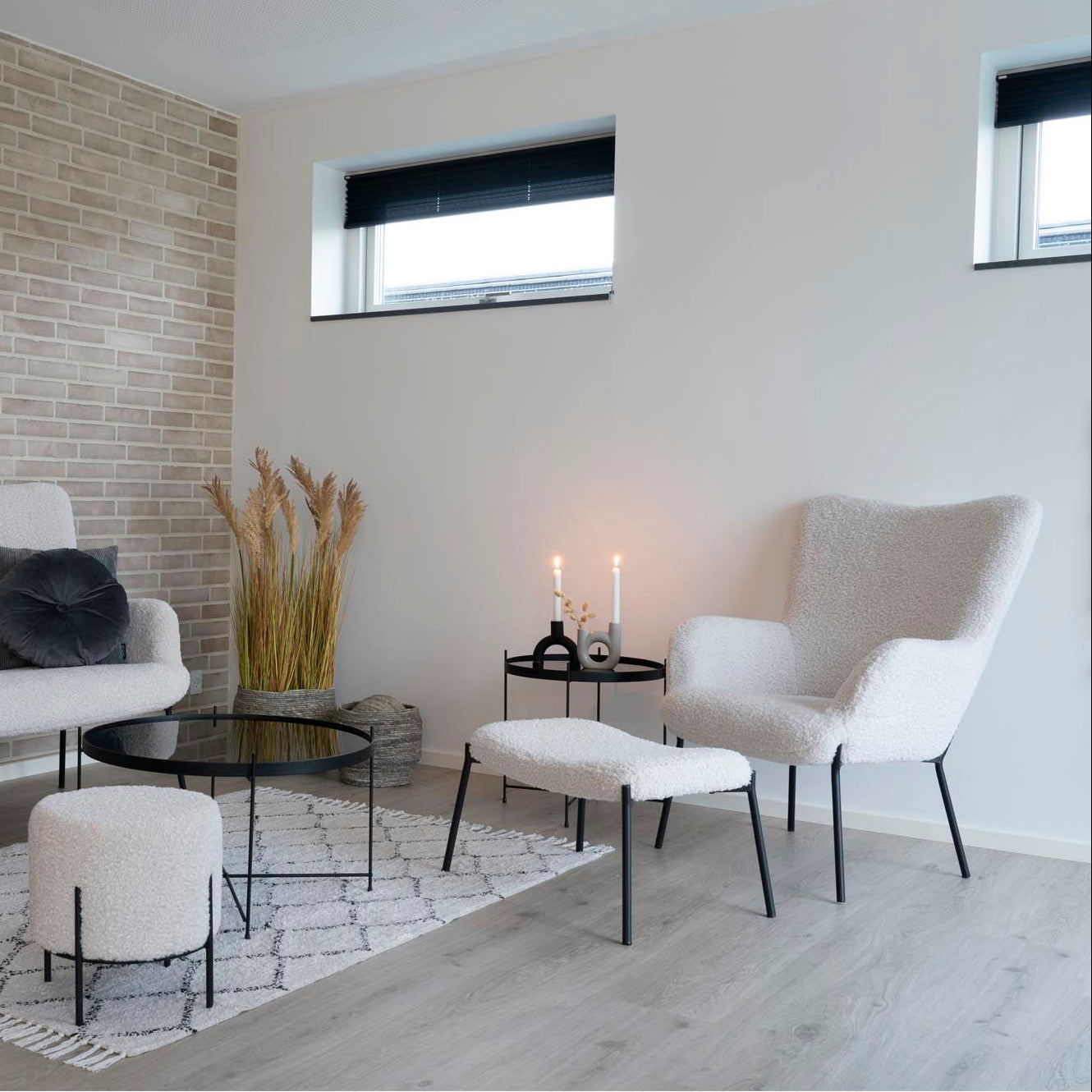 Den høye ryggen, de myke armene og den tilhørende skammelen gjør settet godt egnet når du vil sitte lenge og komfortabelt. Den hvite teddyoverflaten tilfører en lun og myk tekstur, mens de slanke sorte bena gir en fin kontrast som gjør uttrykket lettere og mer moderne. Resultatet er et møbelsett som både gir god støtte og tilfører rommet et lyst og eksklusivt preg.