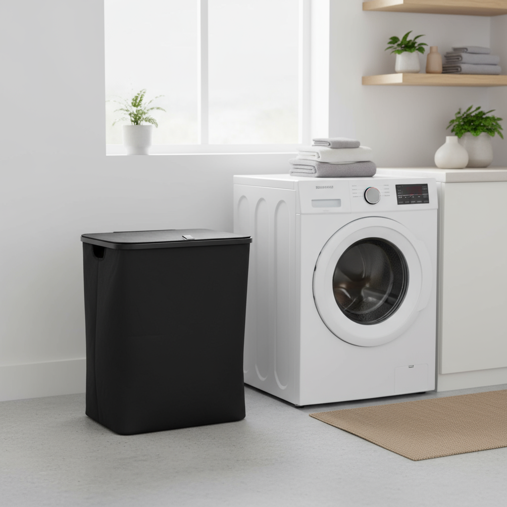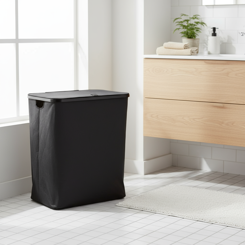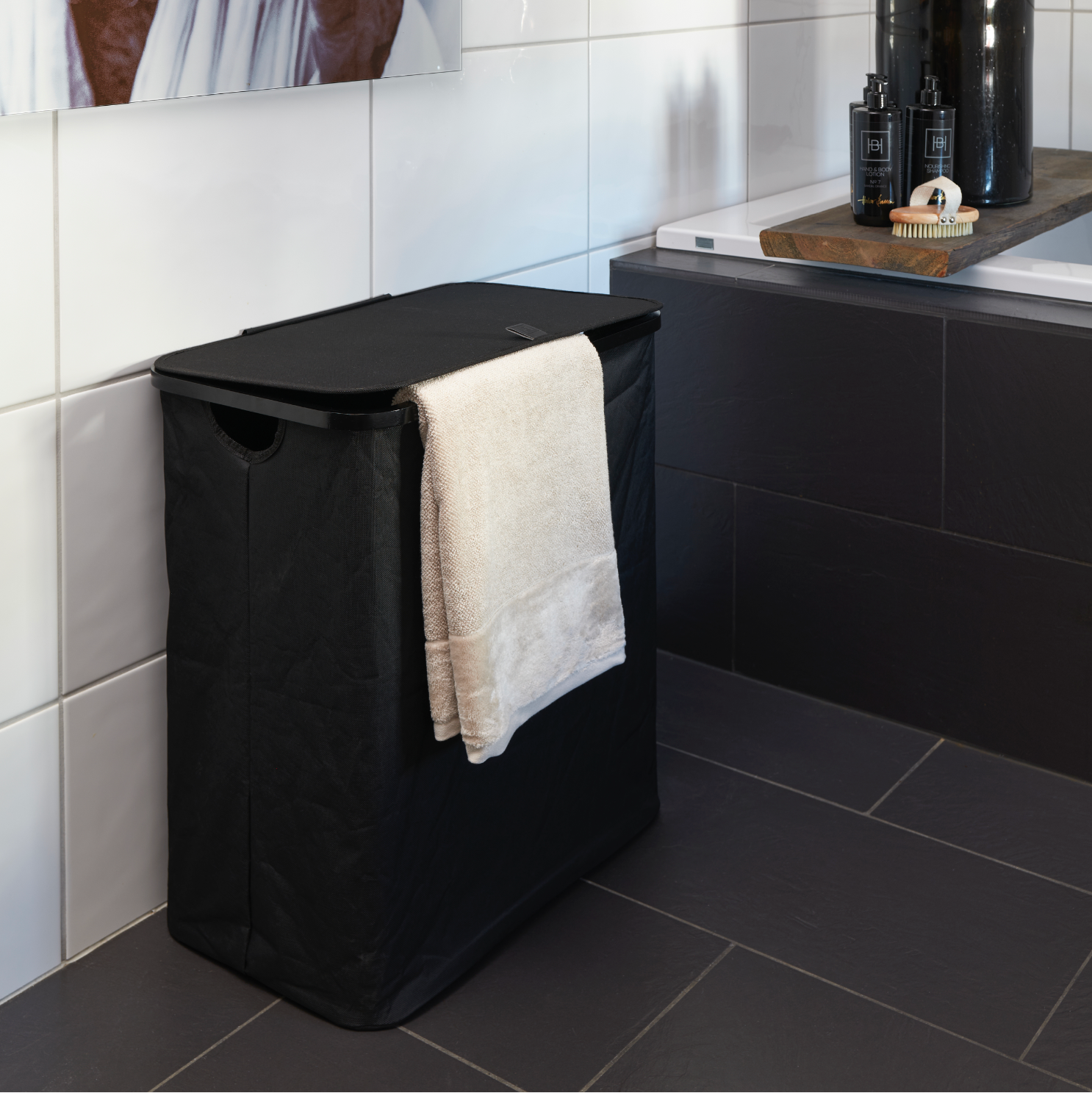 Gio skittentøyskurv fra Halvor Bakke kombinerer funksjon og design på elegant vis. Den er laget i slitesterkt polyesterstoff, er svært lett og gir et ryddig uttrykk på badet.