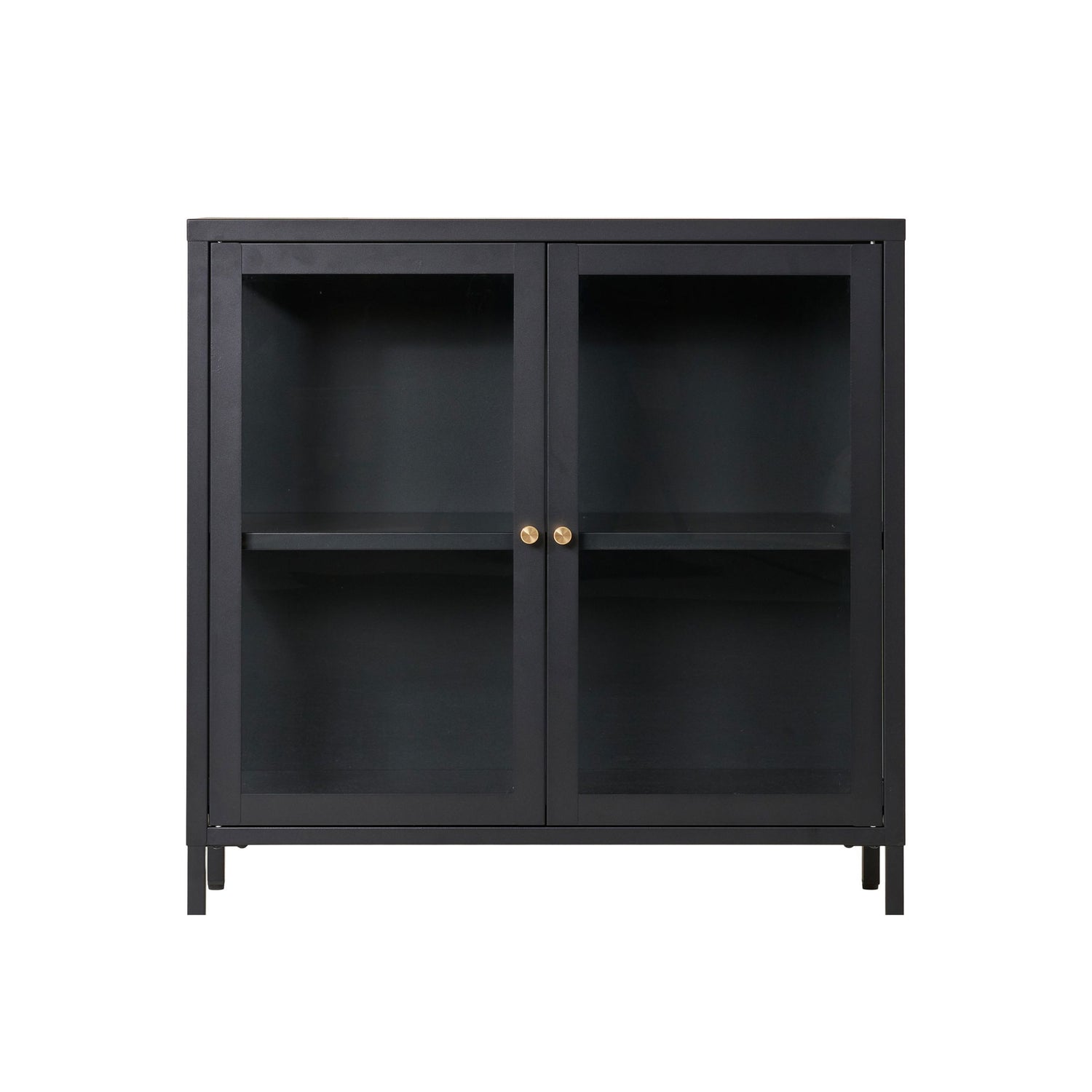 Dalby Cabinet skap i sort metall med to glassdører og hyller – moderne oppbevaringsløsning til stue, kjøkken eller gang.