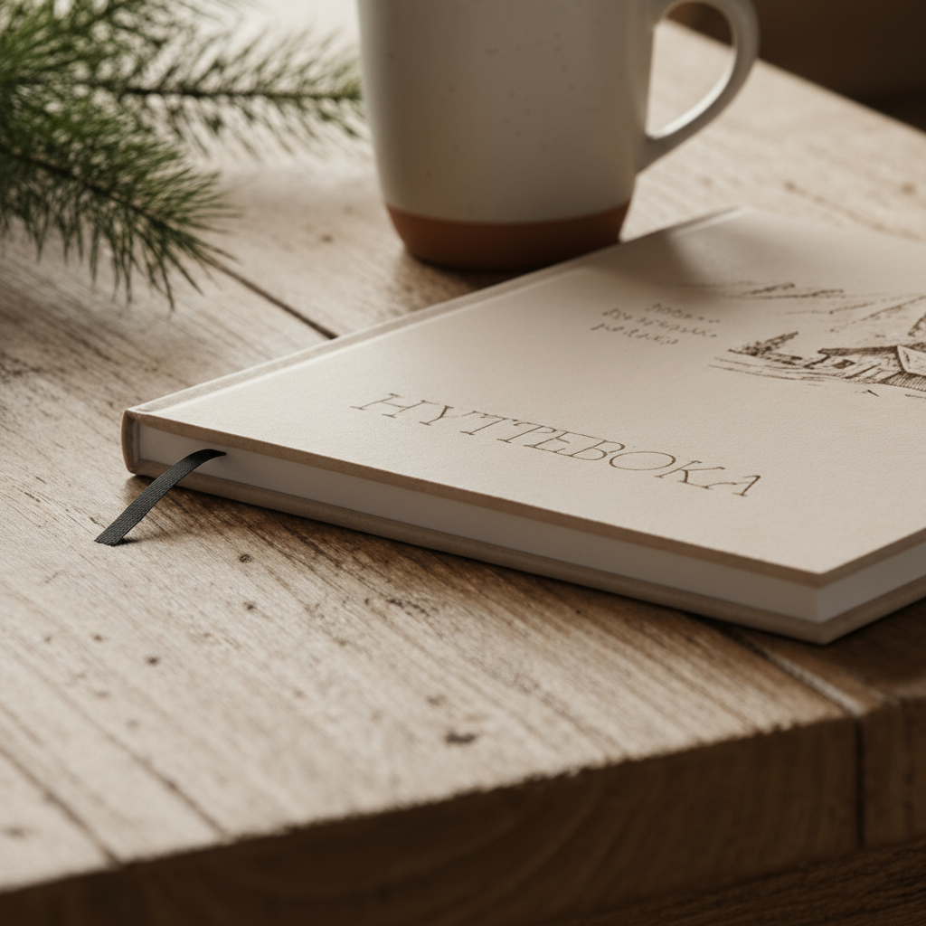 Boka har solid innbinding, og størrelsen 21 × 24 cm gir god plass til hilsener, historier og små glimt fra hyttelivet. Med bokmerke i bånd finner du enkelt tilbake til siste side.