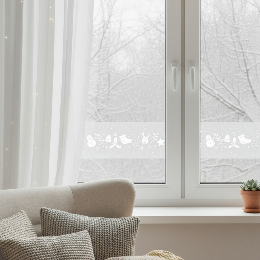 Vindusfolie med julemotiv og frostet effekt brukt på stuevindu