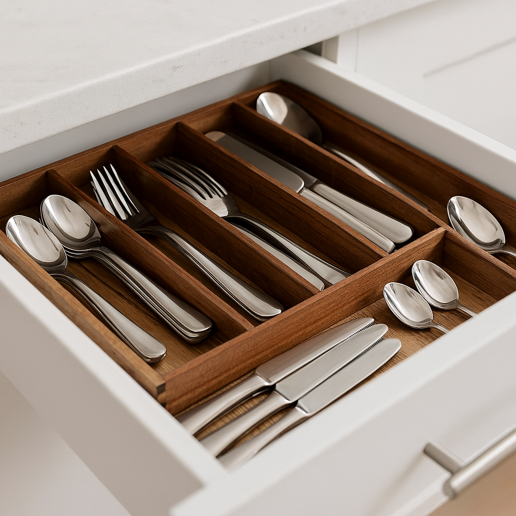 Uttrekkbar bestikkskuff i tre med flere rom for kniver, gafler, skjeer og kjøkkenutstyr