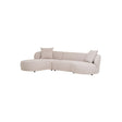 Romslig loungesofa med venstrevendt sjeselong og to puter. Sofaen har avrundede linjer og lav rygg som gir et behagelig og balansert uttrykk. Trukket i mykt stoff med nøytral fargetone som passer godt inn i ulike interiørstiler.