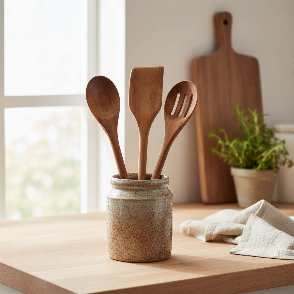 Sett med tre praktiske kjøkkenredskaper i vakkert akasietre. Perfekt til matlaging og servering.