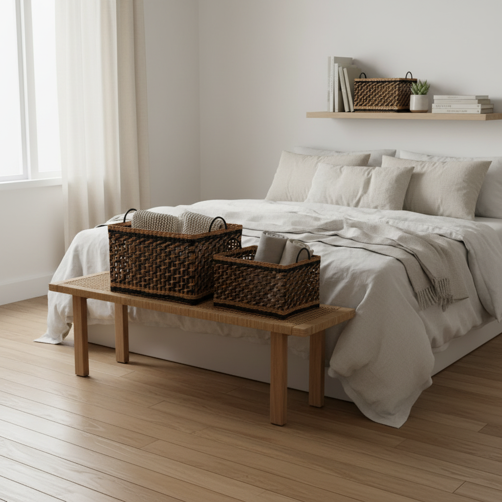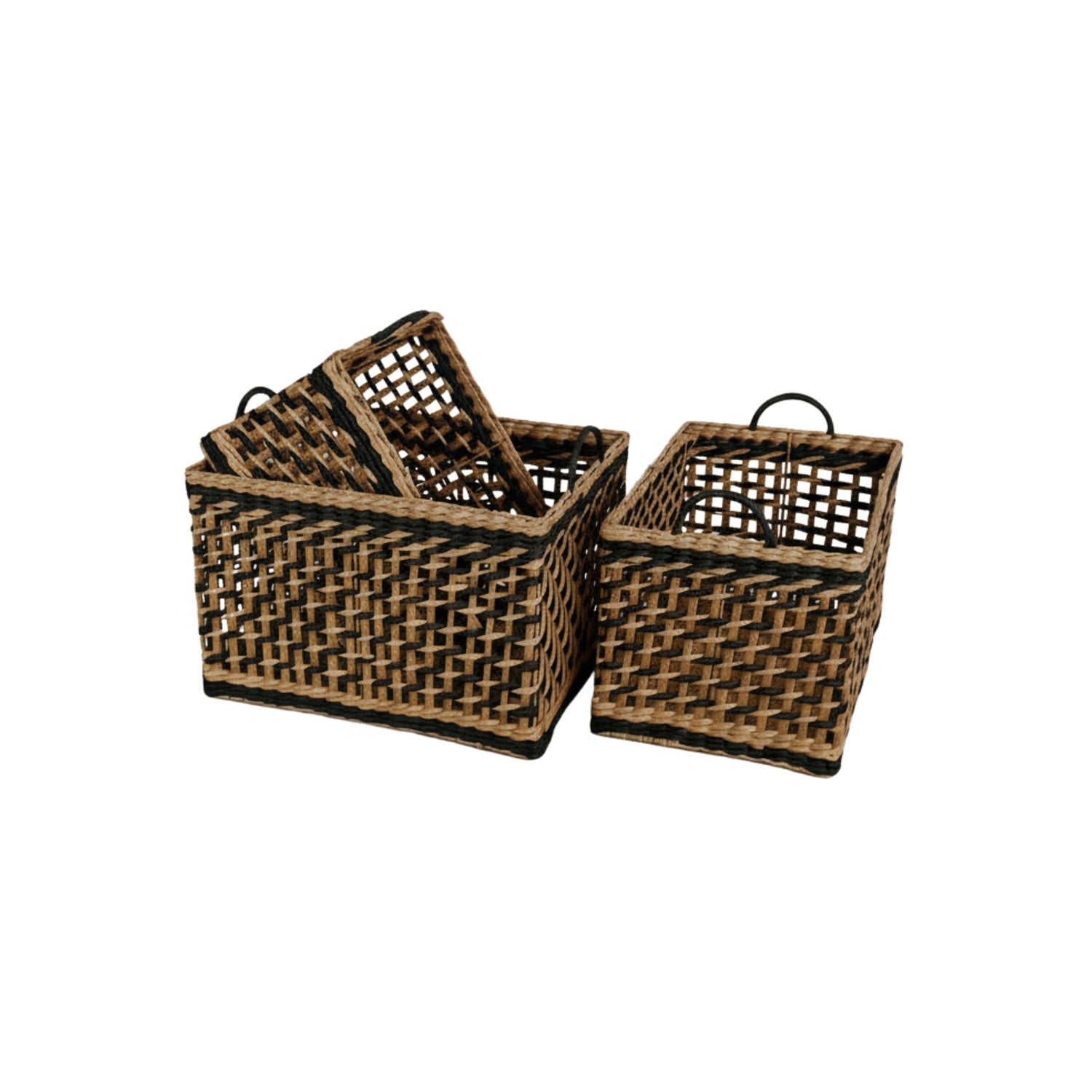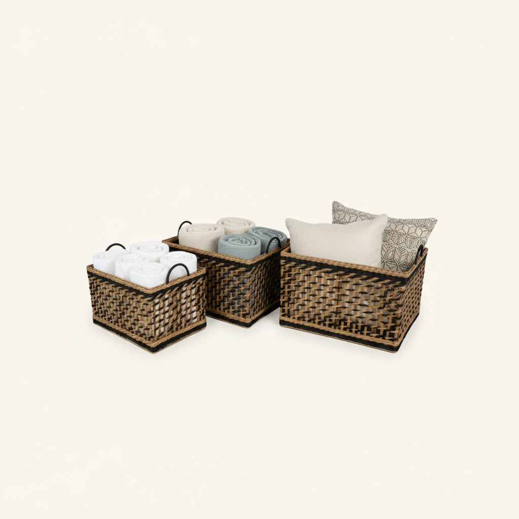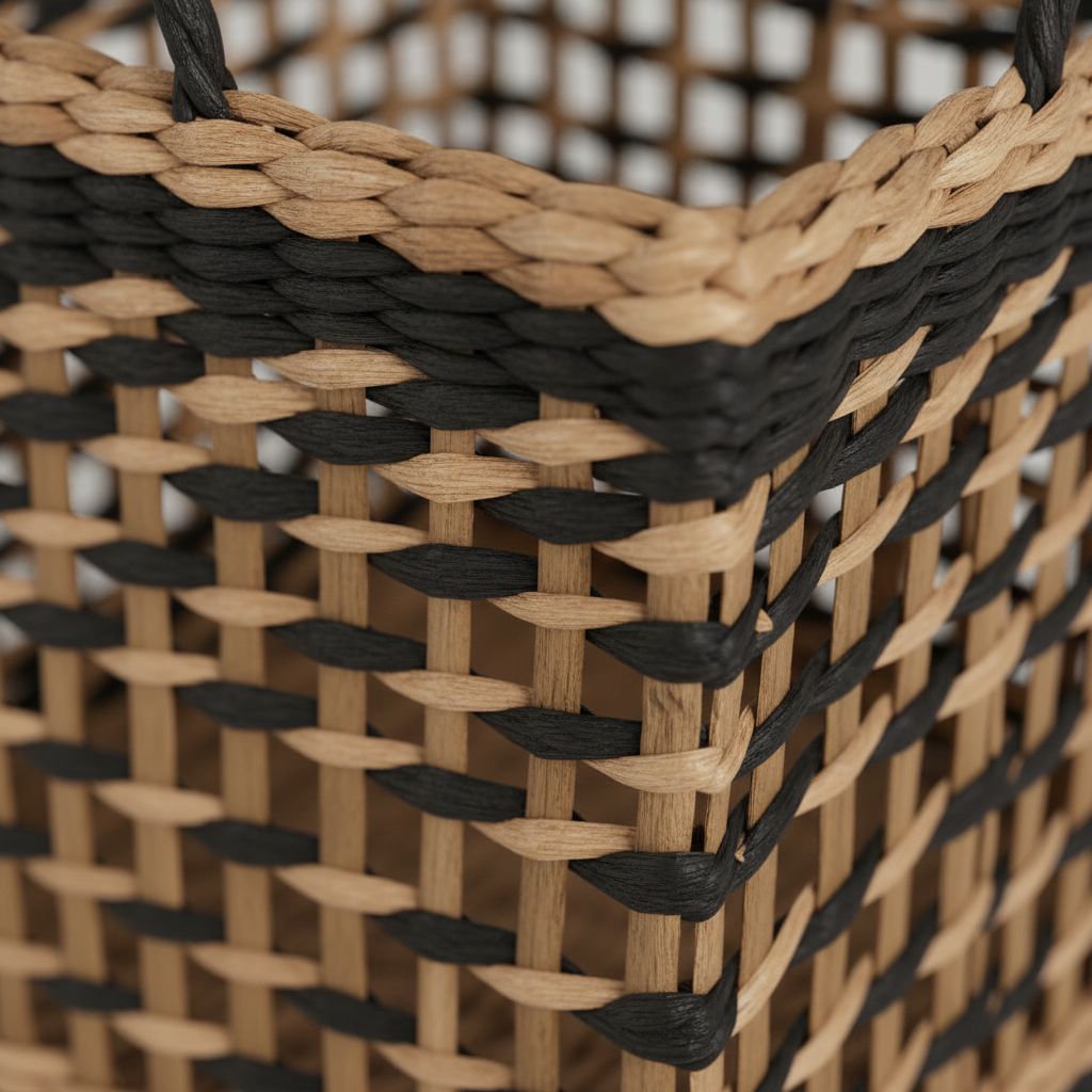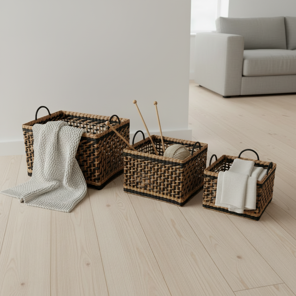 Denne kurvserien blander naturens varme med moderne sorte detaljer, et visuelt pusterom i hjemmet ditt. Håndflettede fibre gir hver kurv sin egen karakter, mens den robuste konstruksjonen tåler hverdagens krav.