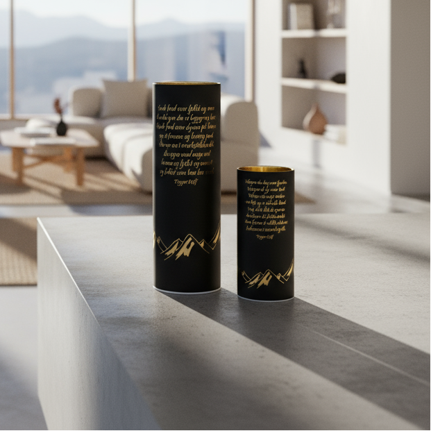 Skap varm nordnorsk stemning med dette vakre settet av to lyslykter i matt sort metall. Begge har innebygd LED-lys som sprer et mykt og behagelig skinn gjennom motivet og sitatene fra Trygve Hoff. Designet er inspirert av naturen i nord og kombinerer moderne form med en nostalgisk atmosfære som passer i ethvert hjem.