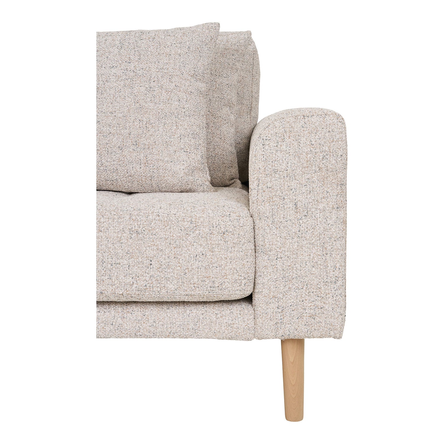 Lido Lounge Sofa er en romslig og komfortabel hjørnesofa i melert beige tekstil med venstrevendt sjeselong. Sofaen leveres med fire ekstra pynteputer og har solide ben i naturlig tre som gir et lyst og moderne uttrykk. Med dyp sittekomfort, slitesterkt stoff og tidløst design er dette en sofa som passer både i stue og oppholdsrom.