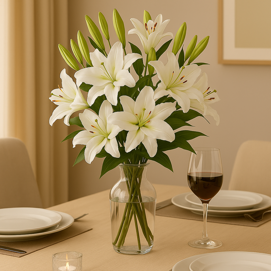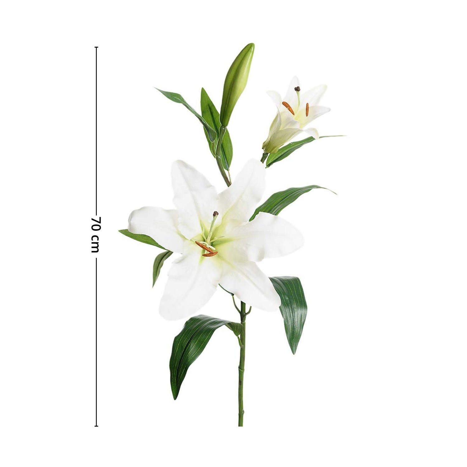 Med delikate, hvite liljeblomster, realistiske støvbærere og friske grønne blader, gir den et sofistikert uttrykk som passer perfekt i alt fra buketter og vaser til borddekor og høytidsoppsatser.