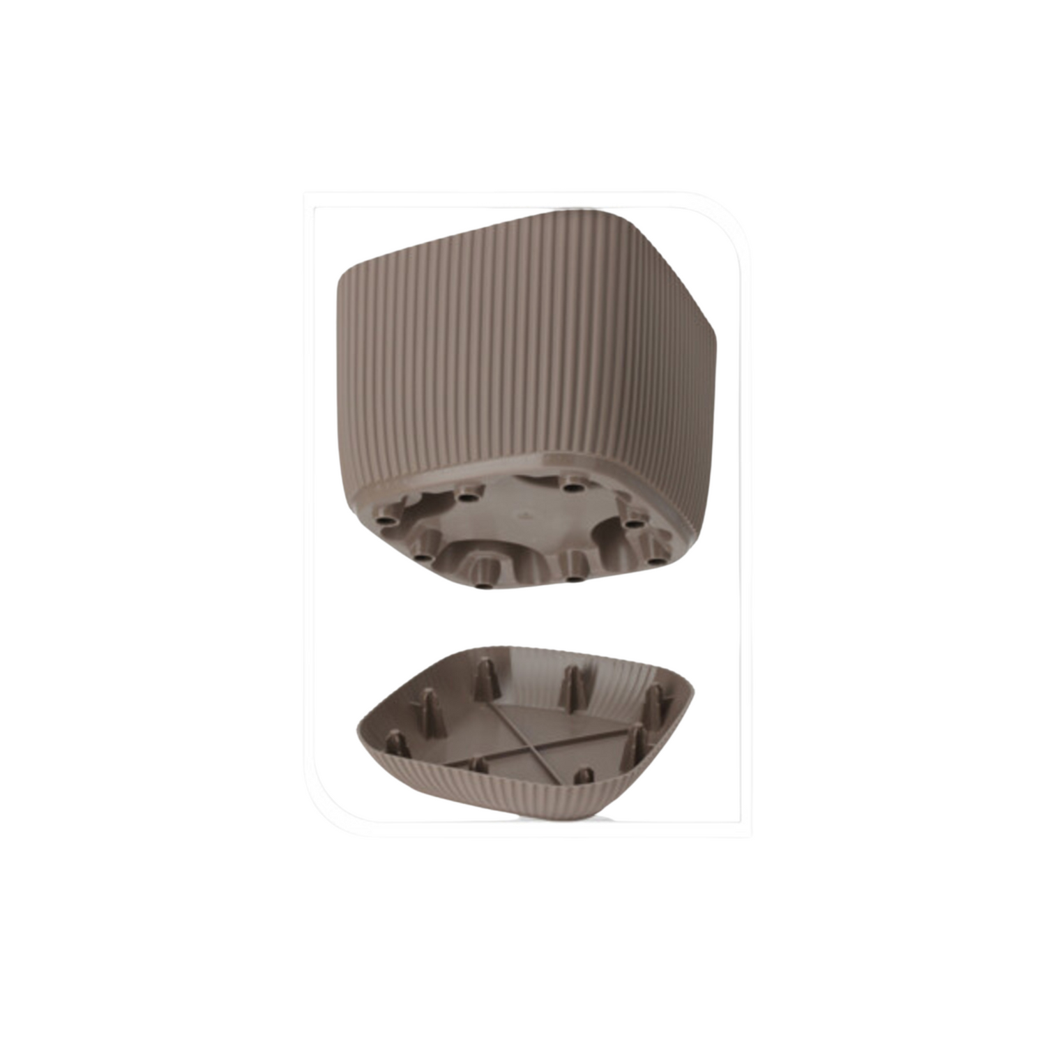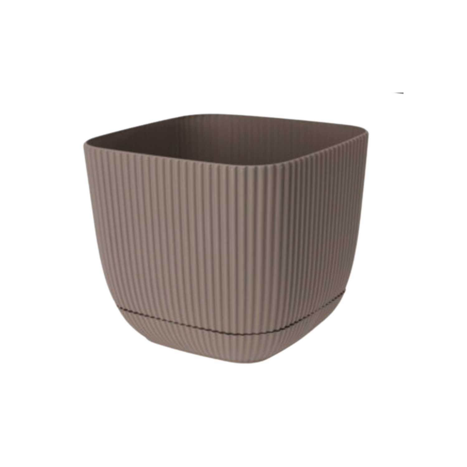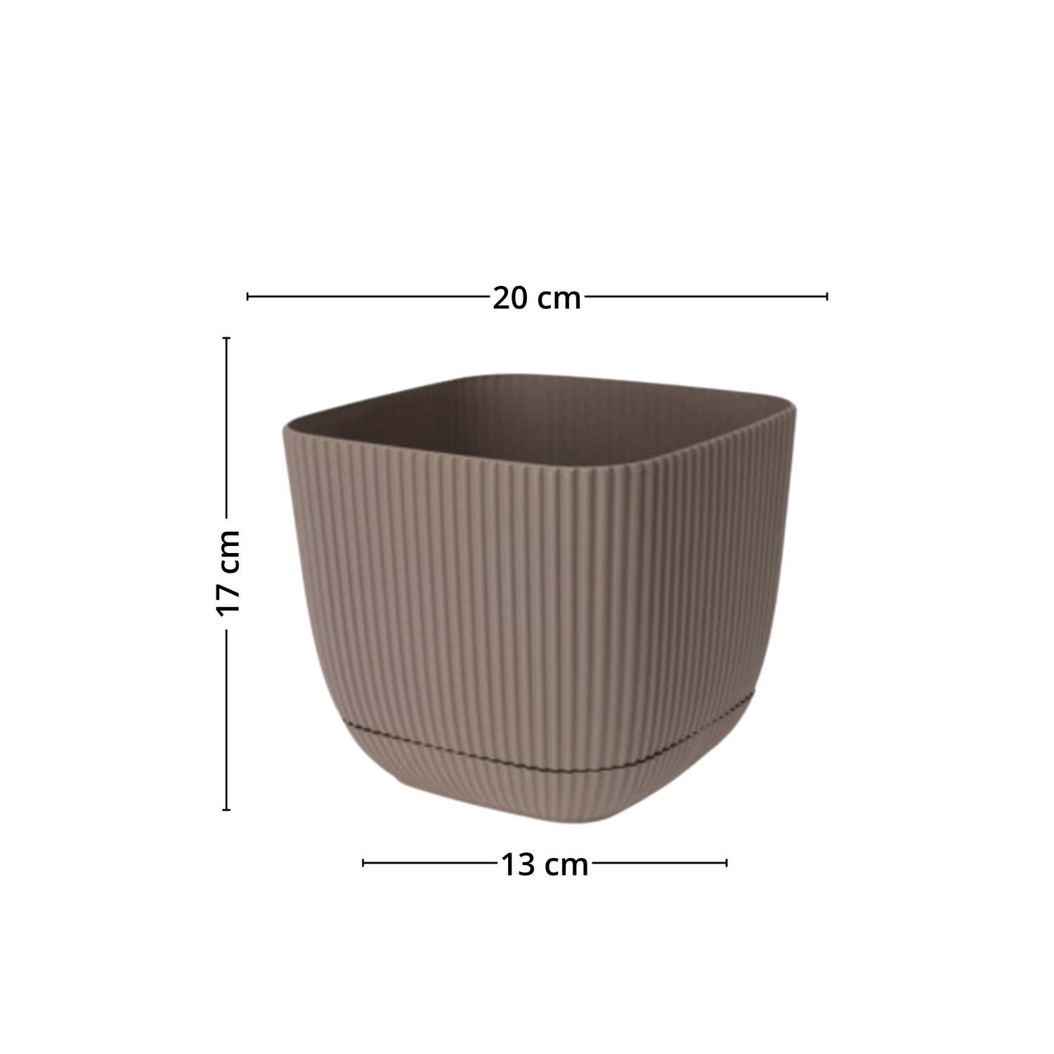 Potten har et moderne, rillet design og en myk, matt overflate som passer perfekt inn i både klassiske og minimalistiske interiørstiler. Den er laget i slitesterk plast og kommer med en integrert skål i bunnen for å fange opp overflødig vann. Praktisk for både inne og utebruk.