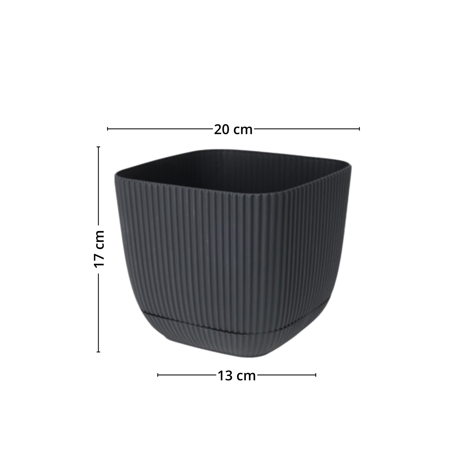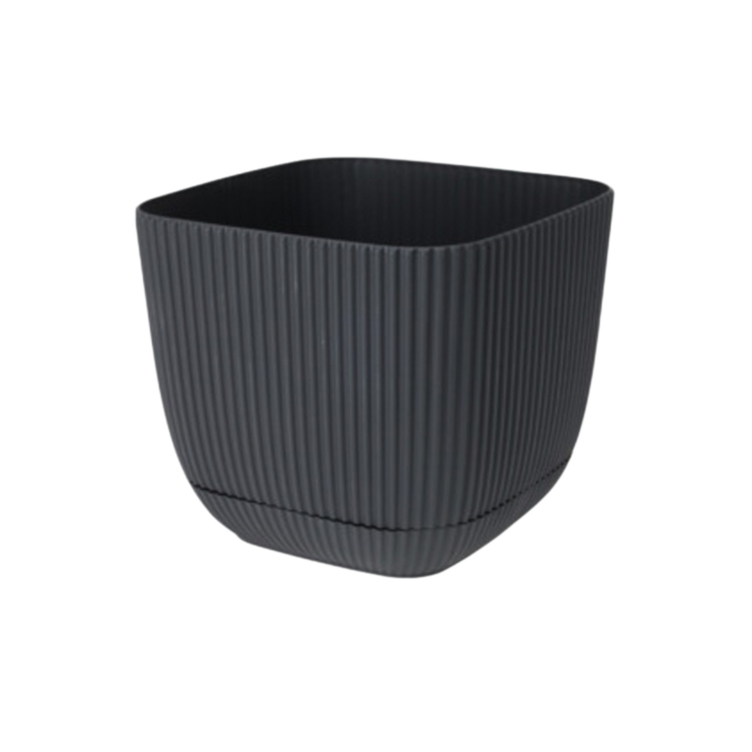 Mørkegrå kvadratisk plastpotte med rillet struktur og løs bunnskål mot hvit bakgrunn.
