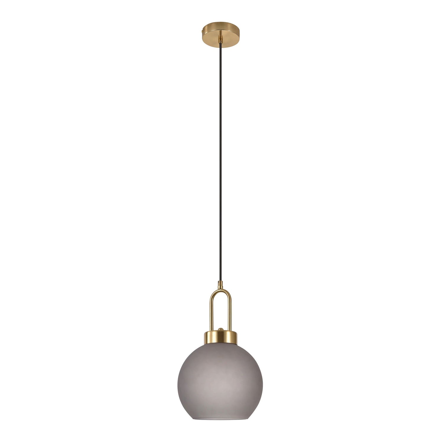 Pendellampe i messingfarget metall med kuppel i frostet glass. Lampen har en tekstilkledd ledning på 150 cm og passer godt over spisebord, på kjøkkenet eller i entreen. Lyskilde kjøpes separat.