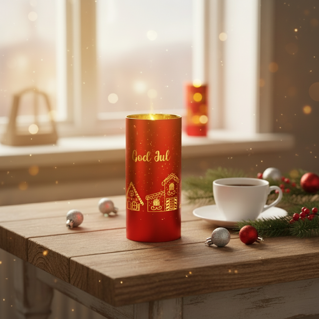 Gi hjemmet et varmt julelys med LED-lykt Pepperkakeby i rød metallfinish. Den lille sylindriske lykten har utskårne detaljer av en koselig pepperkakeby og teksten God Jul, som lyser stemningsfullt når LED-lyset tennes.
