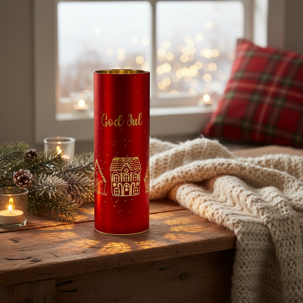 Skap lun og stemningsfull belysning med vår nydelige LED-lykt Pepperkakeby i dyp rød farge. Den sylindriske lykten har utskårne detaljer av en pepperkakeby som lyser vakkert når lyset tennes.