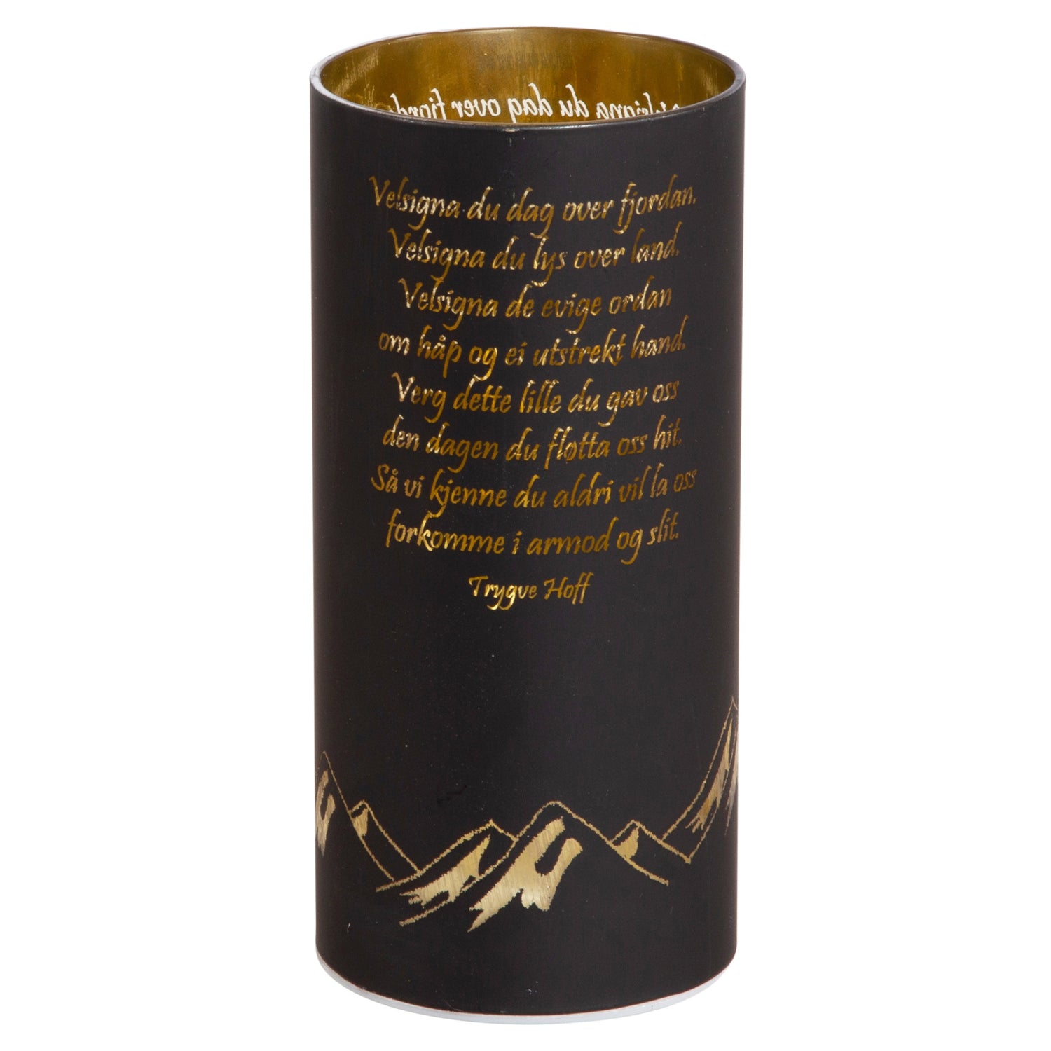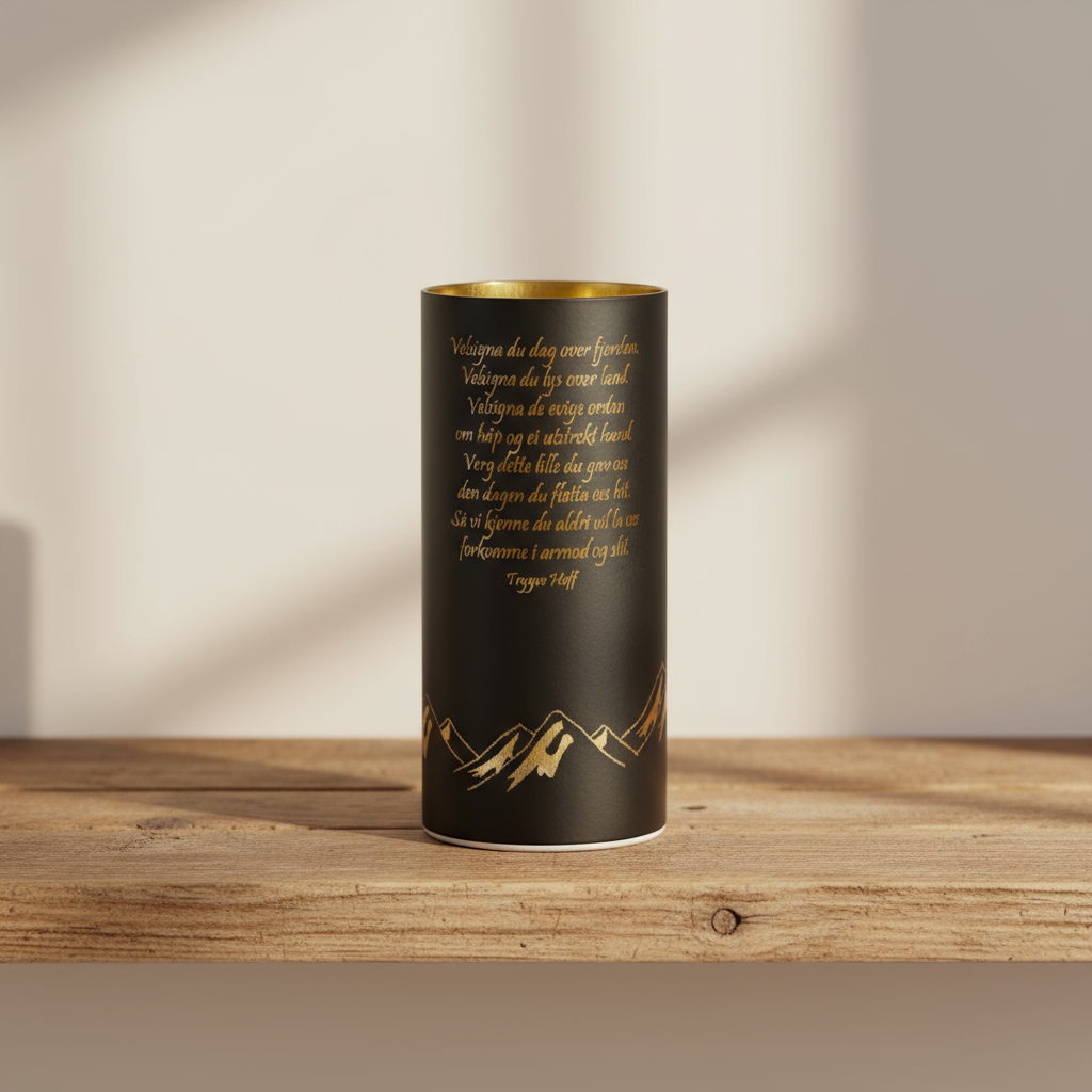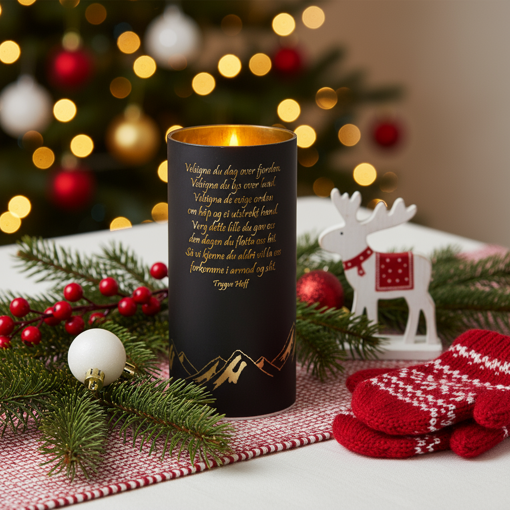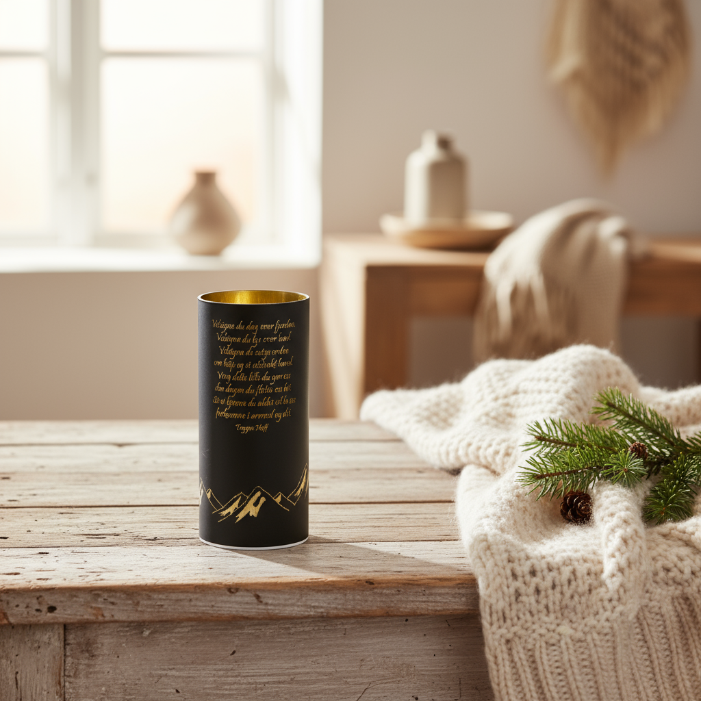 En stemningsfull lyslykt i matt sort med innebygd LED-lys. Designet er inspirert av nordnorsk natur og kombinert med sitat fra Trygve Hoff.