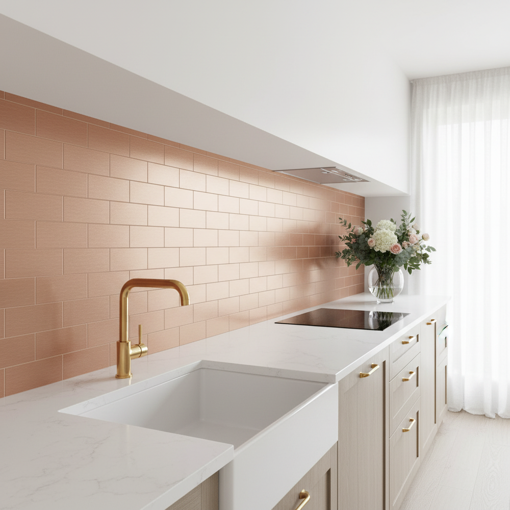 Skap en lun og naturlig atmosfære med Mayra selvklebende veggfliser. Disse flisene kombinerer en elegant, horisontal børstet-kobber med moderne funksjonalitet. Den jevne kobberstrukturen i brune nyanser passer perfekt i både minimalistiske og skandinaviske interiørstiler, og gir en organisk følelse til alt fra kjøkken og stue til gang og kontor.