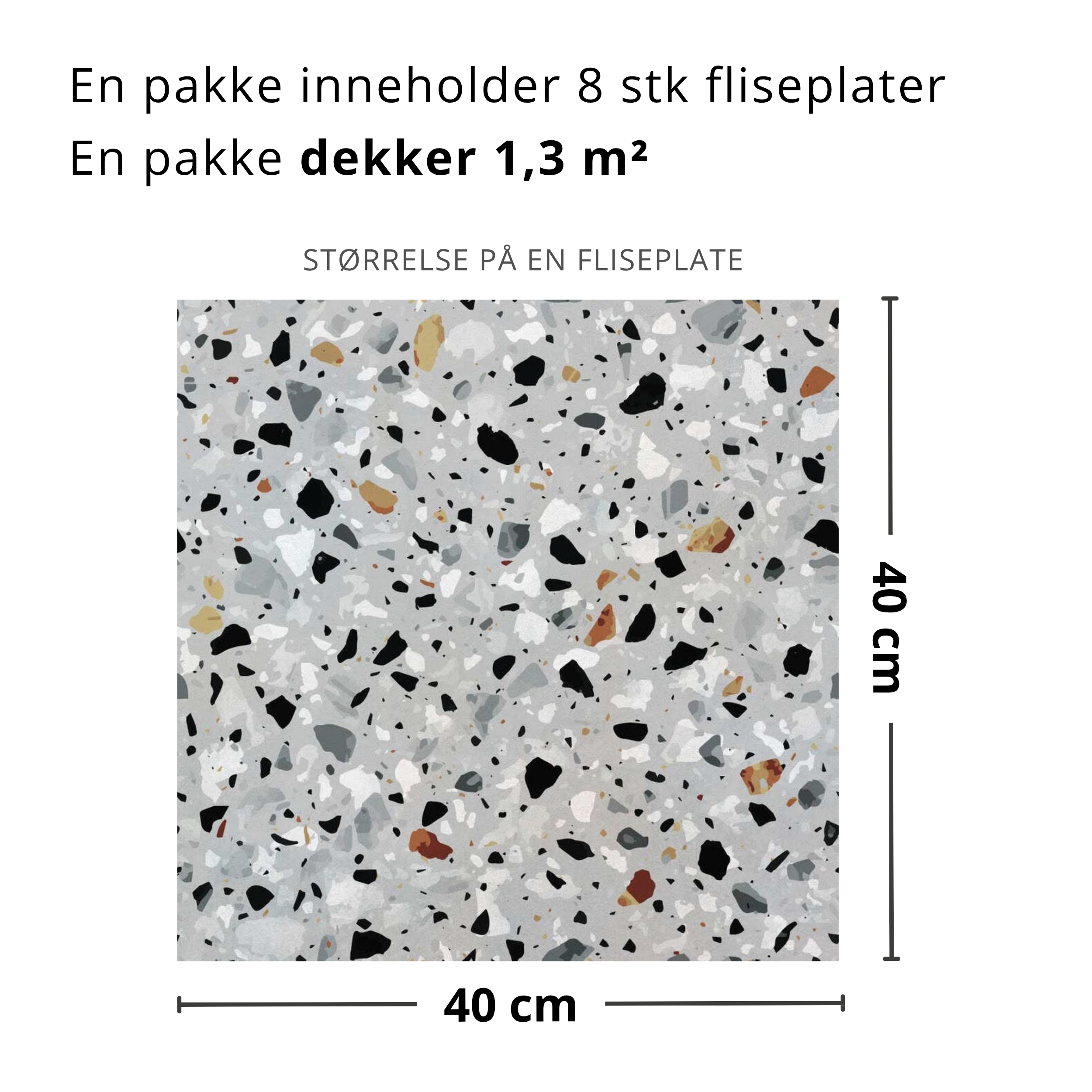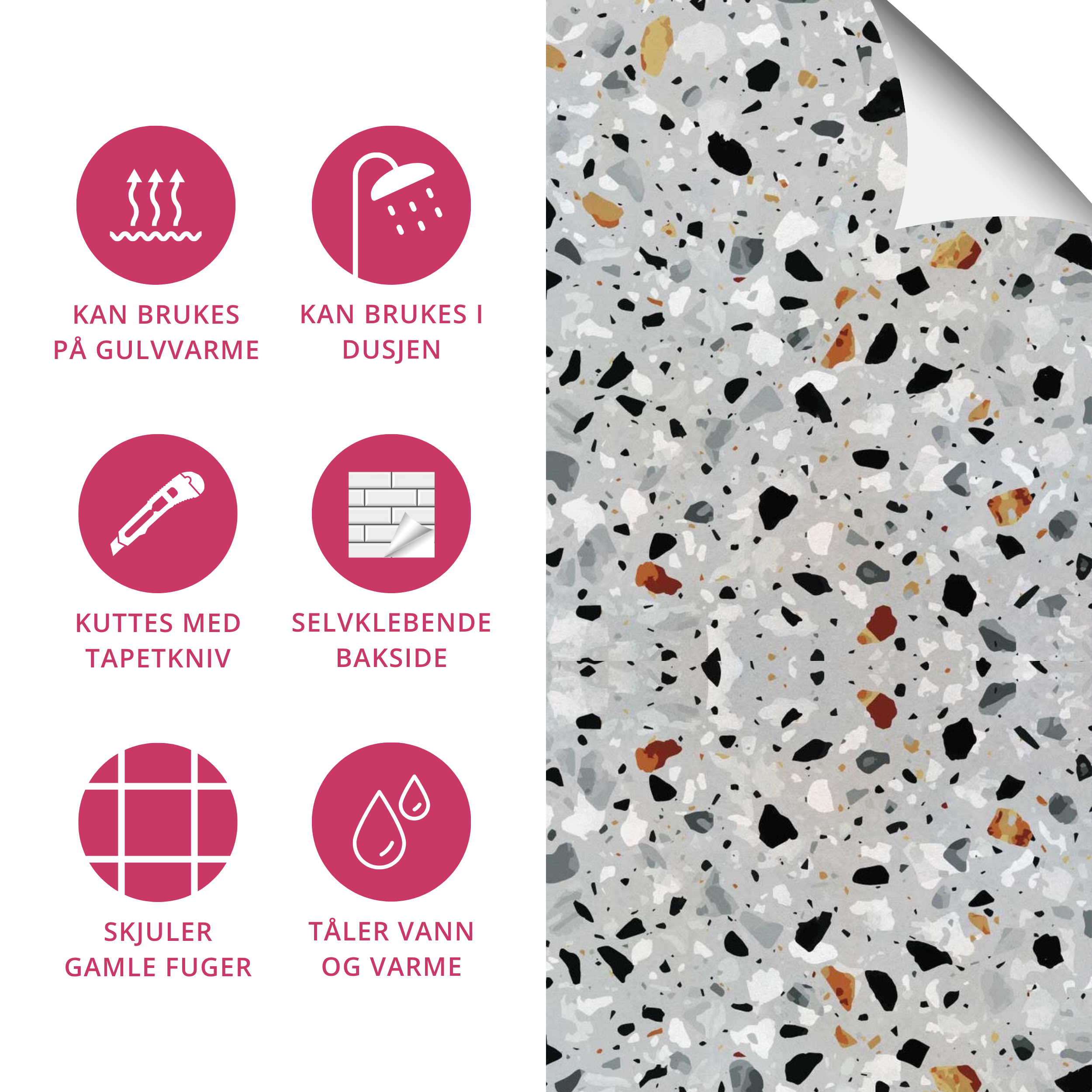 Milano Terazzo selvklebende fliser kombinerer funksjon og estetikk i ett stilrent design. Den lysegrå bakgrunnen med innslag av svart, hvitt, grått og varme rusttoner gir rommet karakter og en tidløs eleganse. Det terrazzo-inspirerte mønsteret passer perfekt til både klassiske og moderne nordiske interiørstiler, og fungerer like godt som veggdekor som til gulvfornyelse.