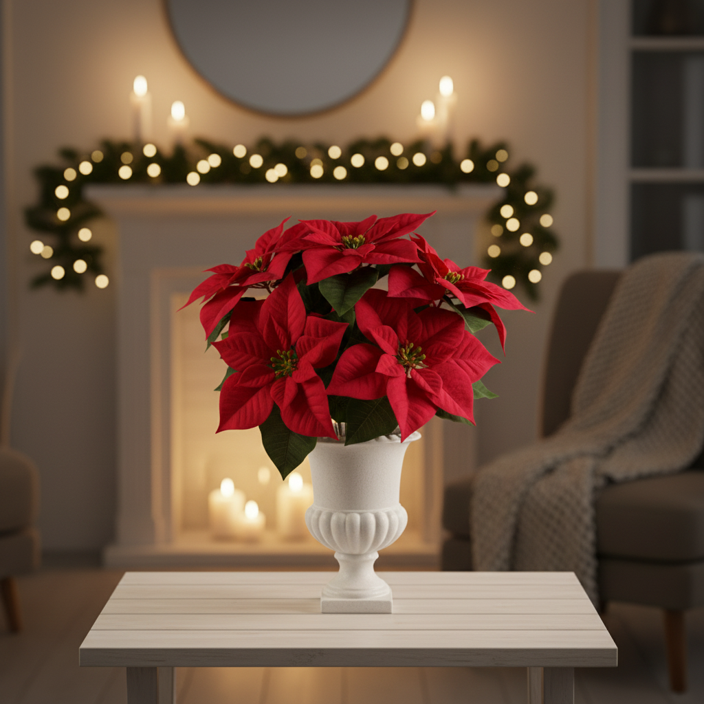 De dype røde blomstene og de realistiske grønne bladene gir en autentisk og varig juledekorasjon uten behov for vanning eller stell.