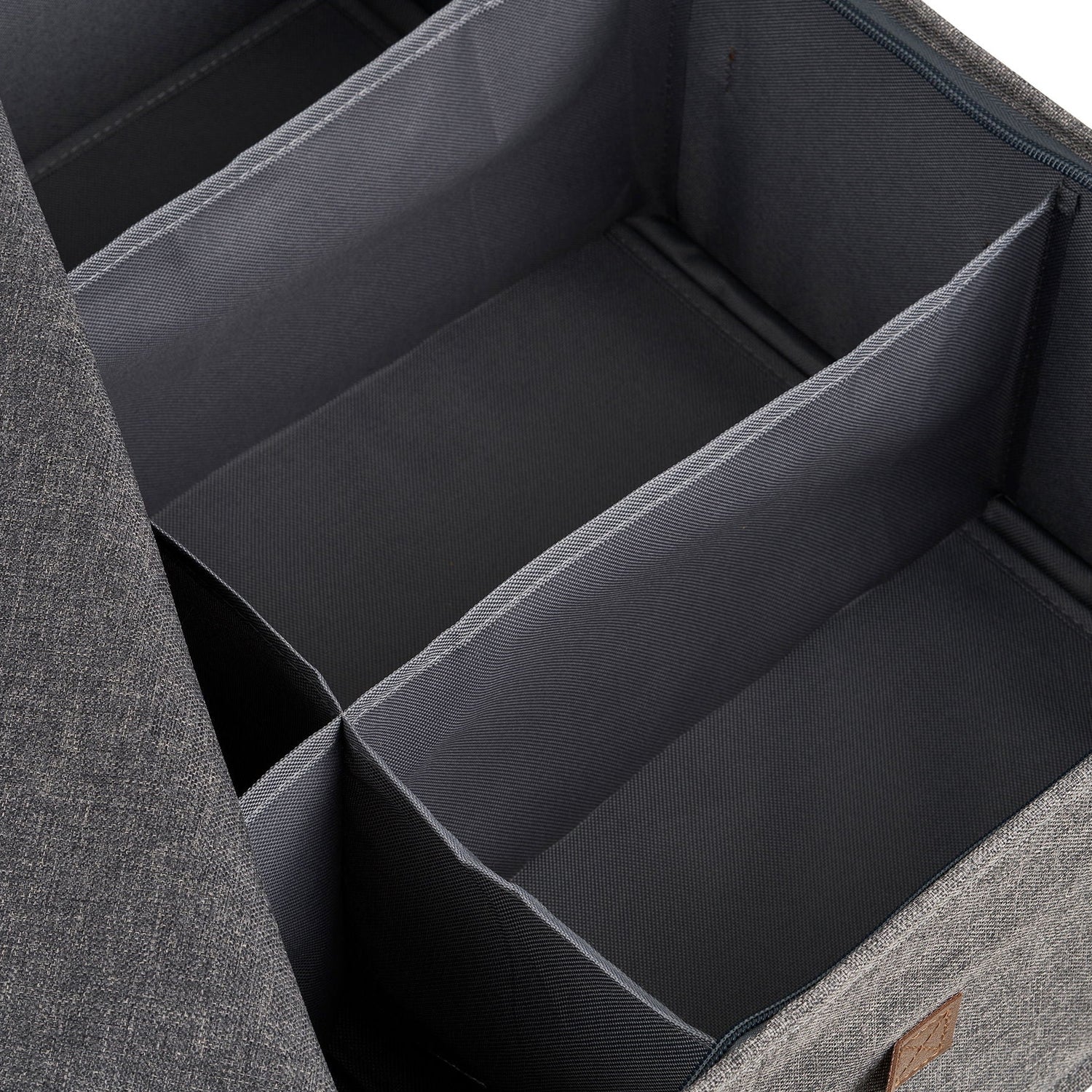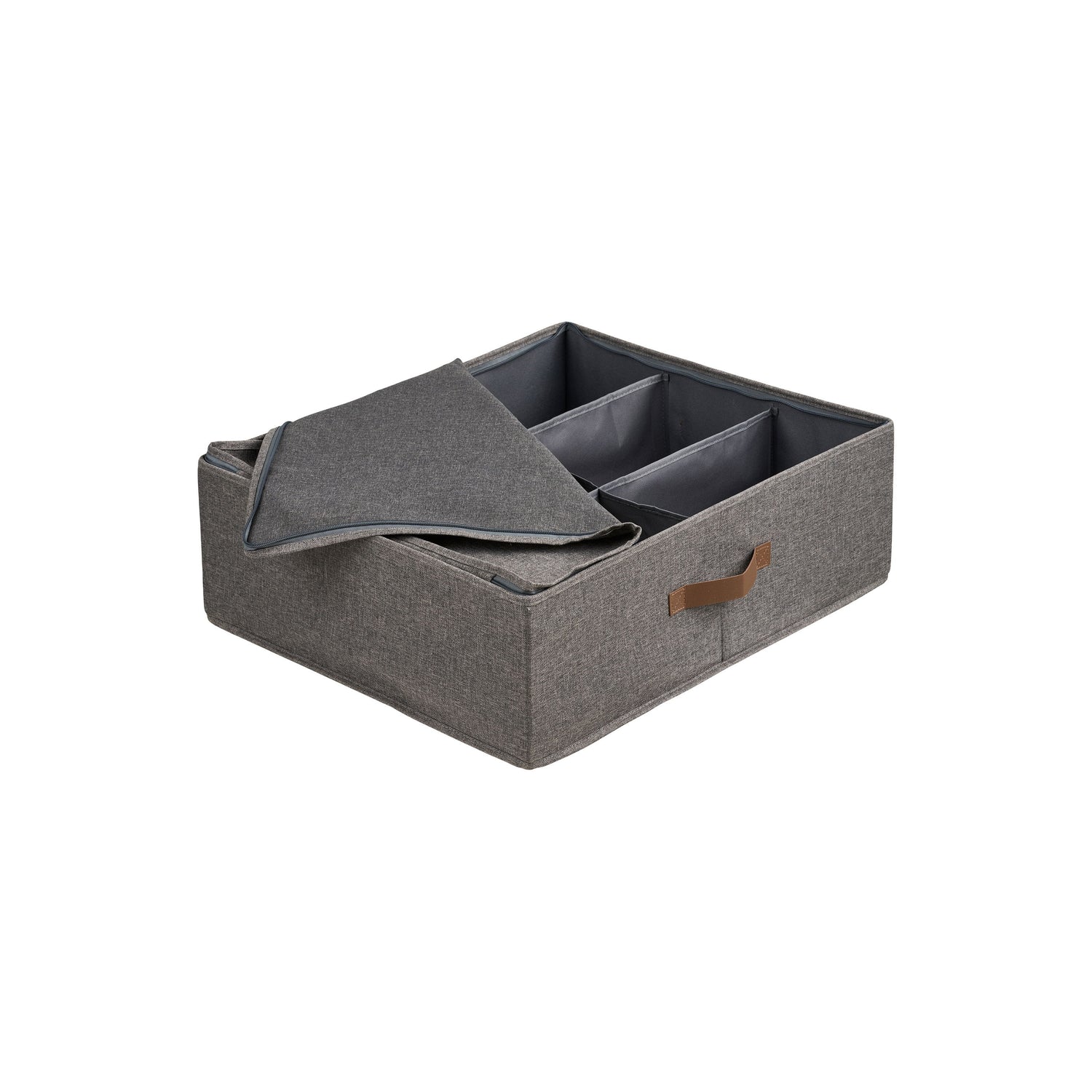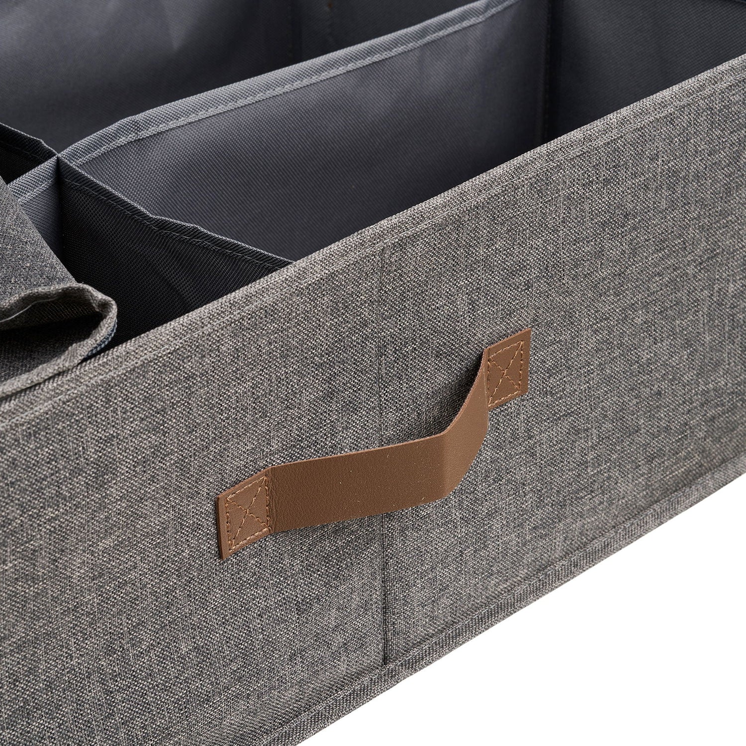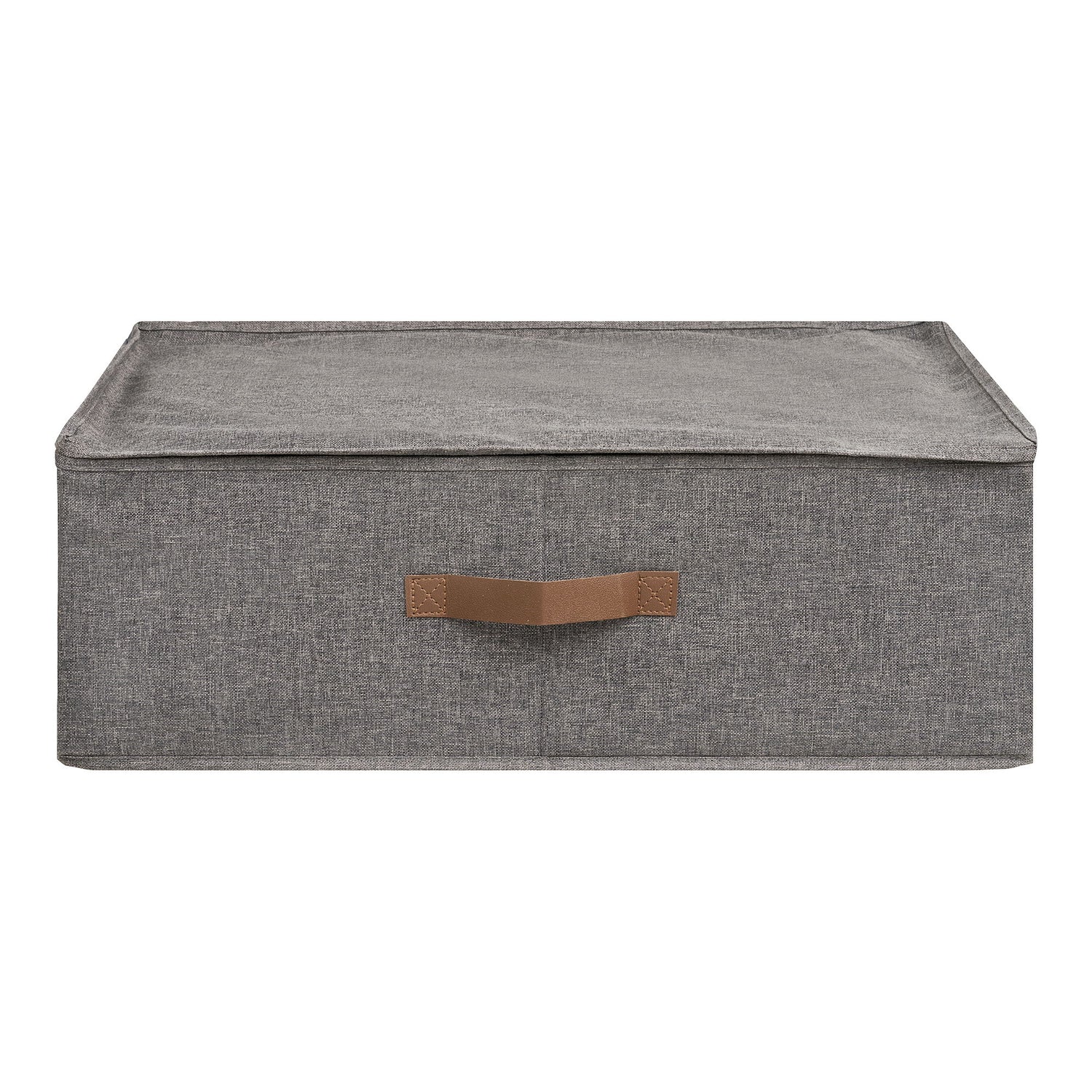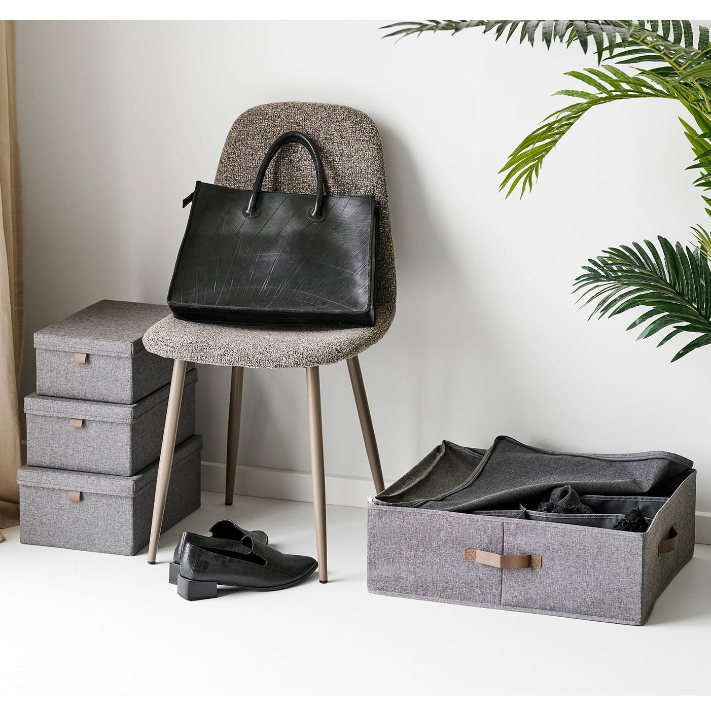 Kurven er trukket i slitesterk polyester i mørk grå nyanse, kombinert med et håndtak i PU som gjør den enkel å trekke ut fra hylle eller skap. Lokket beskytter innholdet mot støv og gir et ryddig uttrykk.