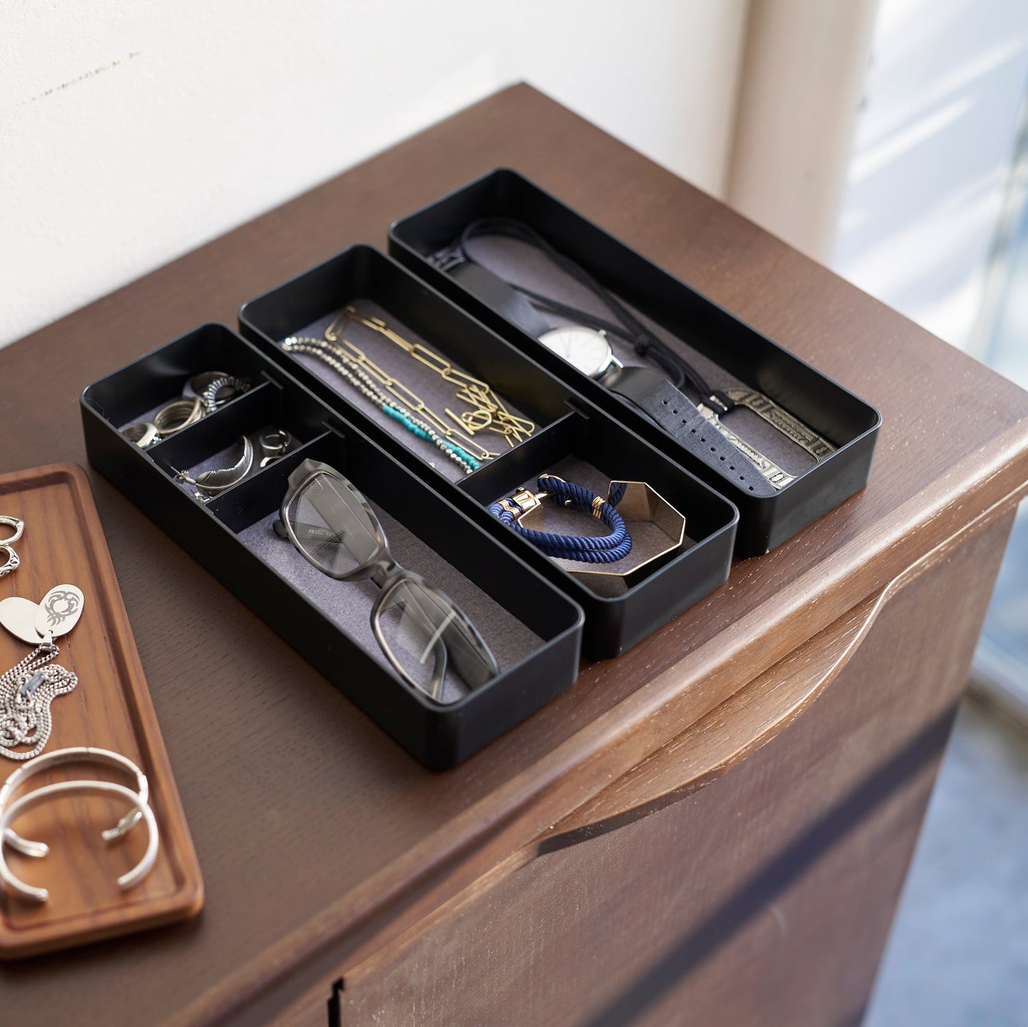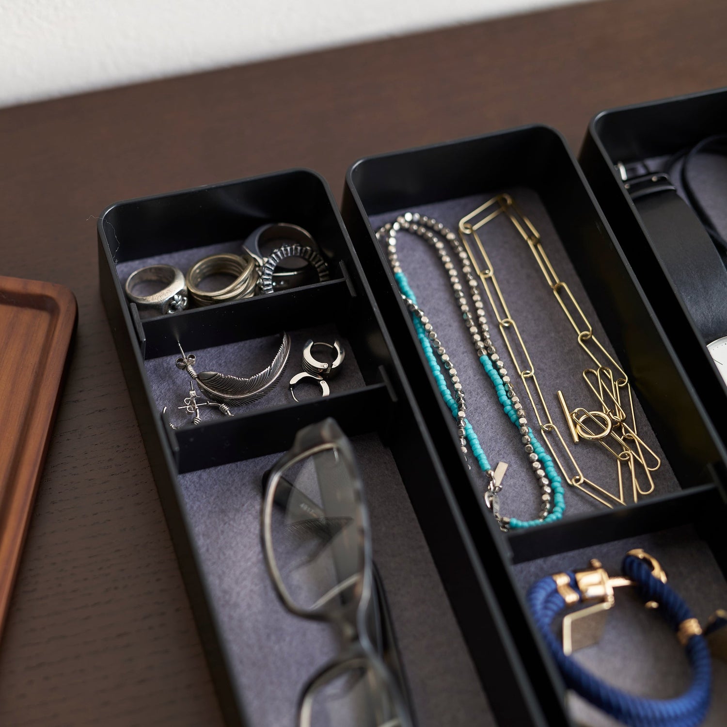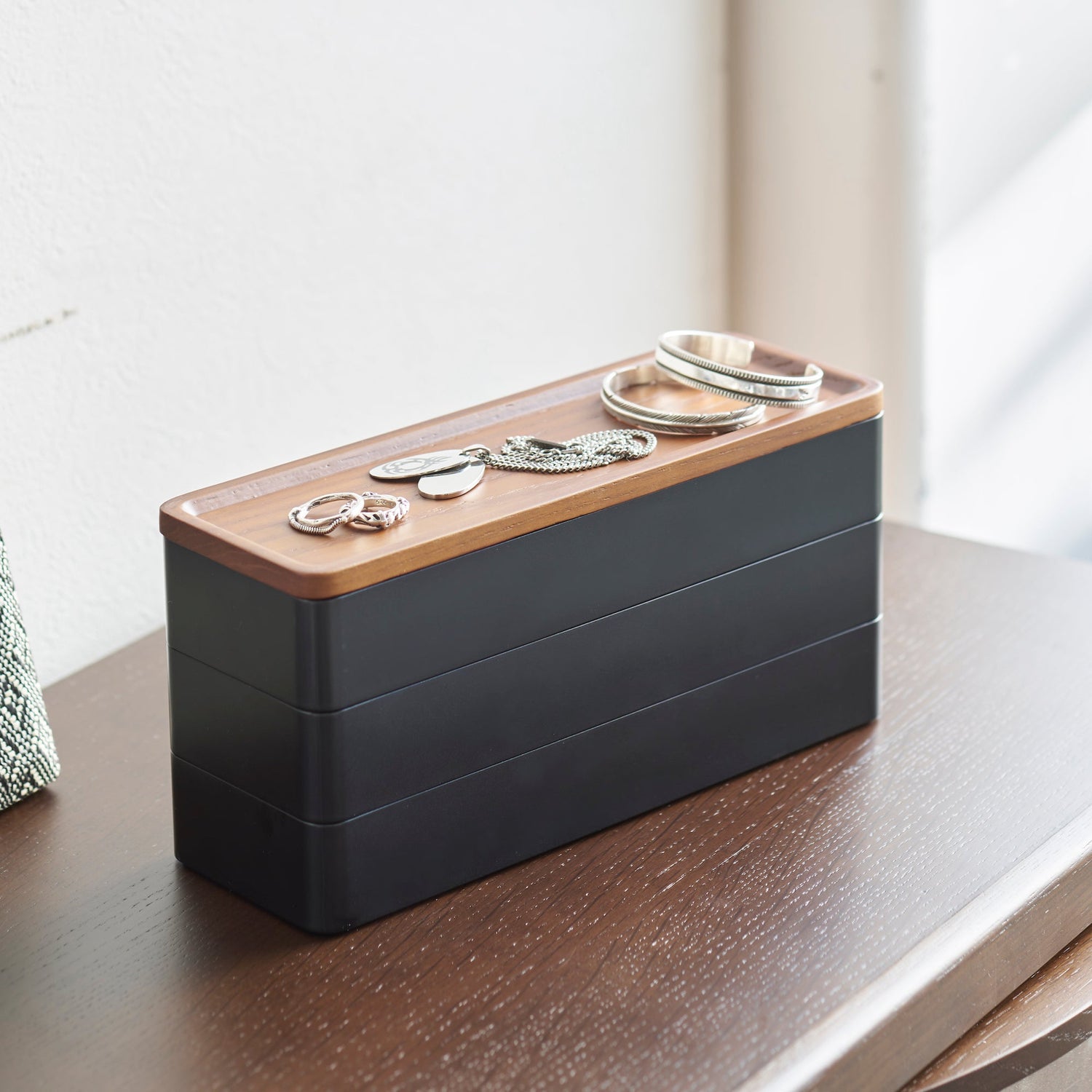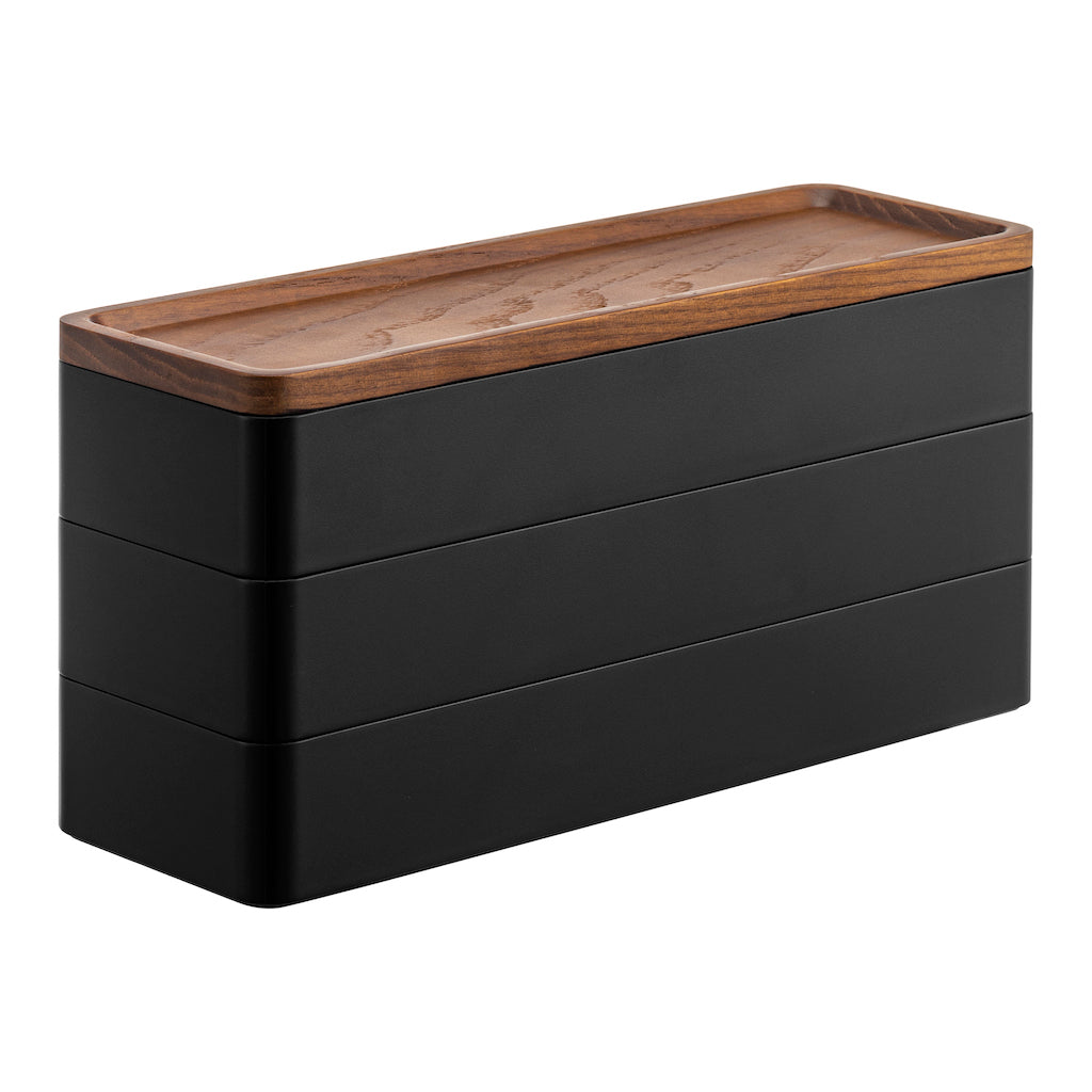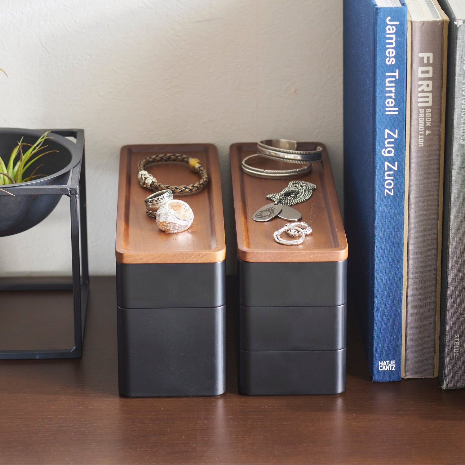 Tre stykk oppbevaringsbokser med lokk, ideelle for smykker, småtilbehør eller kontorrekvisita. Det stablebare designet gir fleksibel organisering, mens trelokket tilfører en varm og sofistikert kontrast.