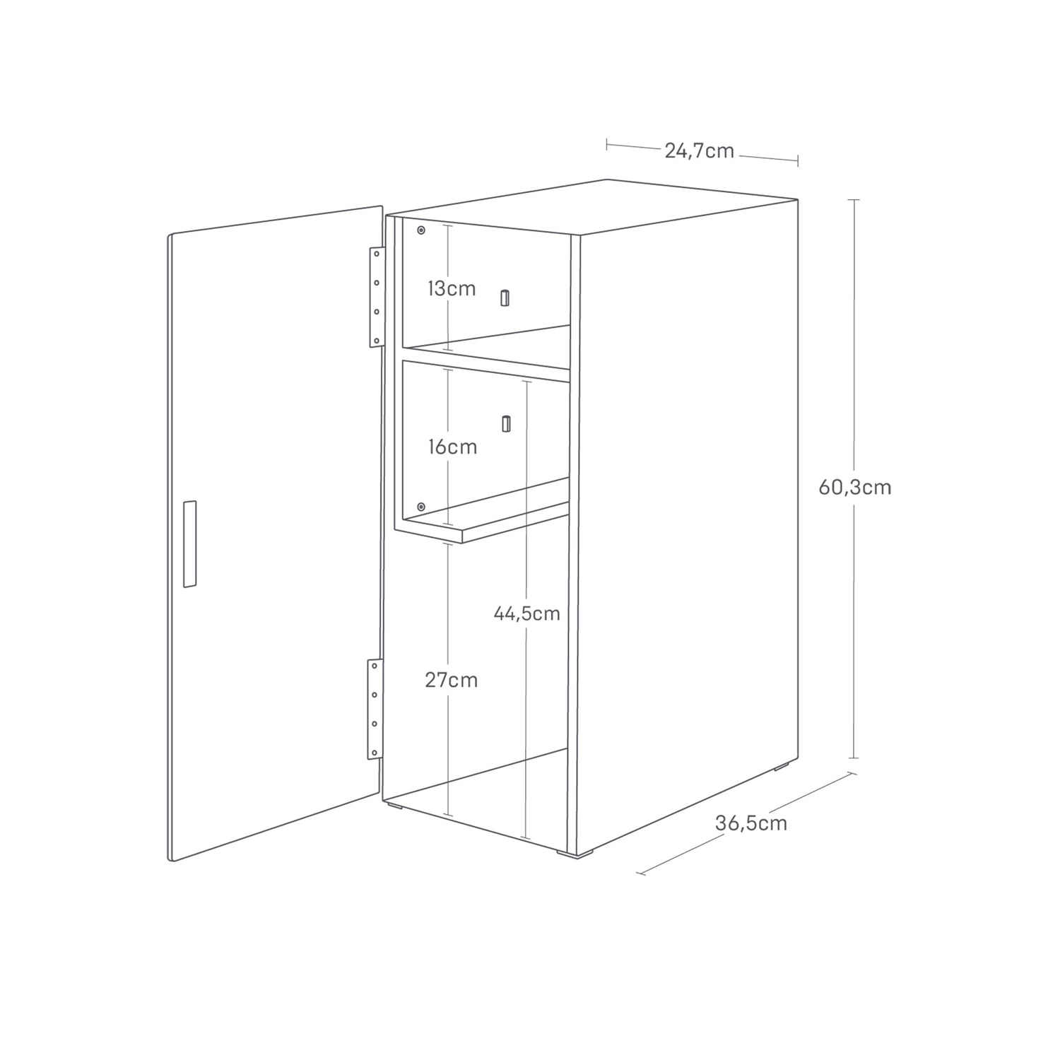 - Mål: bredde 24,7 cm, dybde 36,5 cm, høyde 60,3 cm