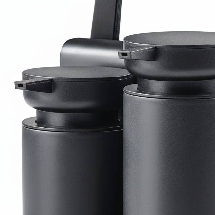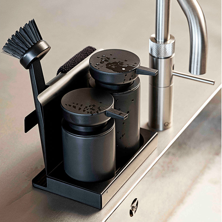 Settet består av keramiske dispensere, metallstativ og integrert brett som samler såpe, børste og klut på ett sted. Den sorte overflaten gir et helhetlig og ryddig uttrykk ved kjøkkenvasken, samtidig som brettet samler opp overflødig vann.