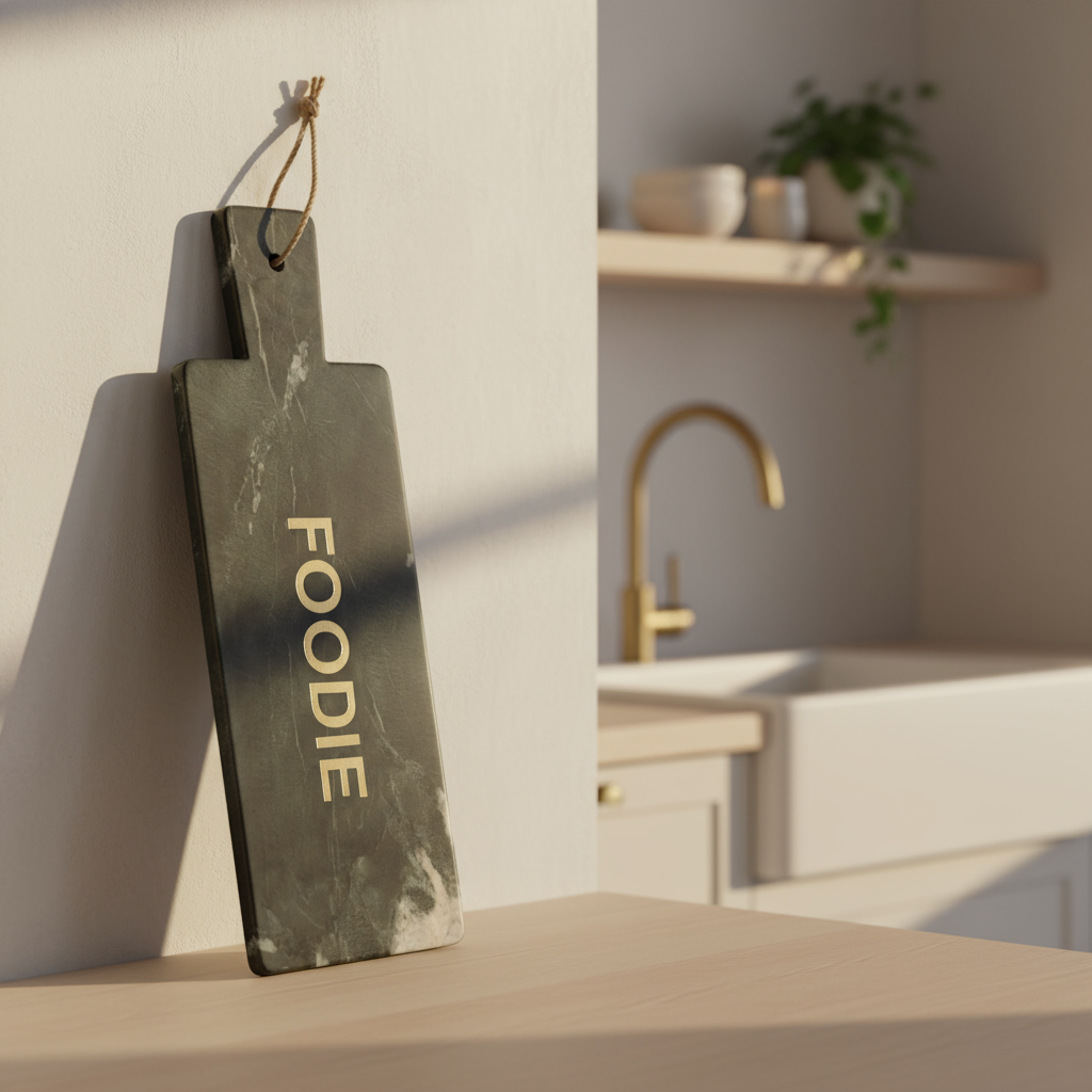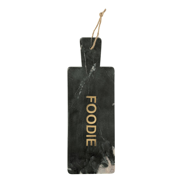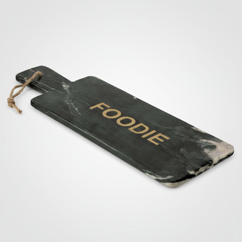Dette eksklusive pyntebrett i svart marmor med gullskrift "FOODIE". Den mørke marmoren med naturlige marmorering med skriften i metall gir et luksuriøst preg.