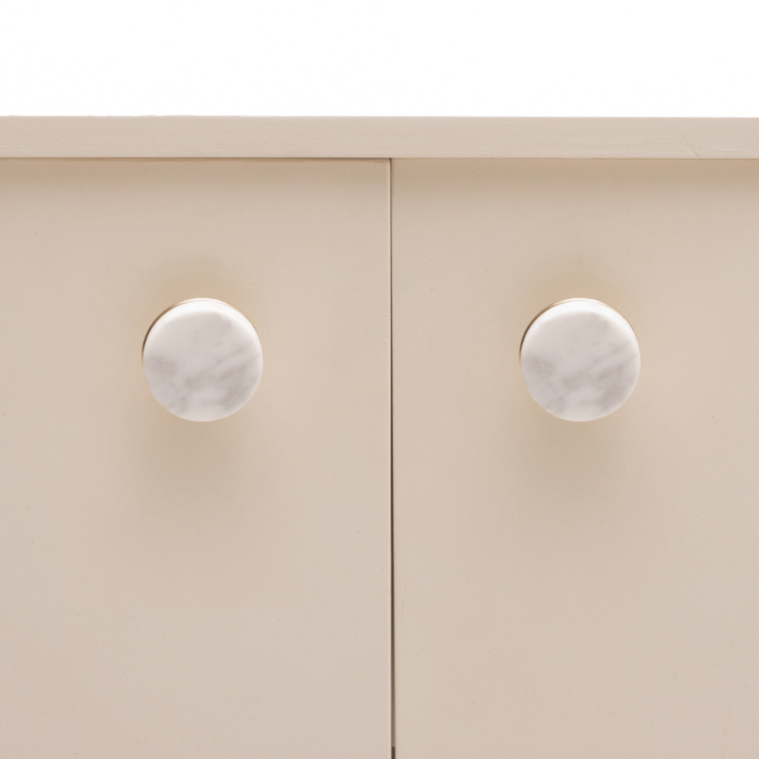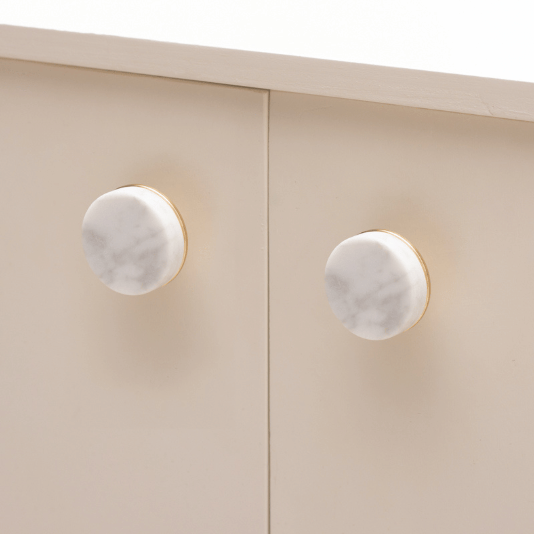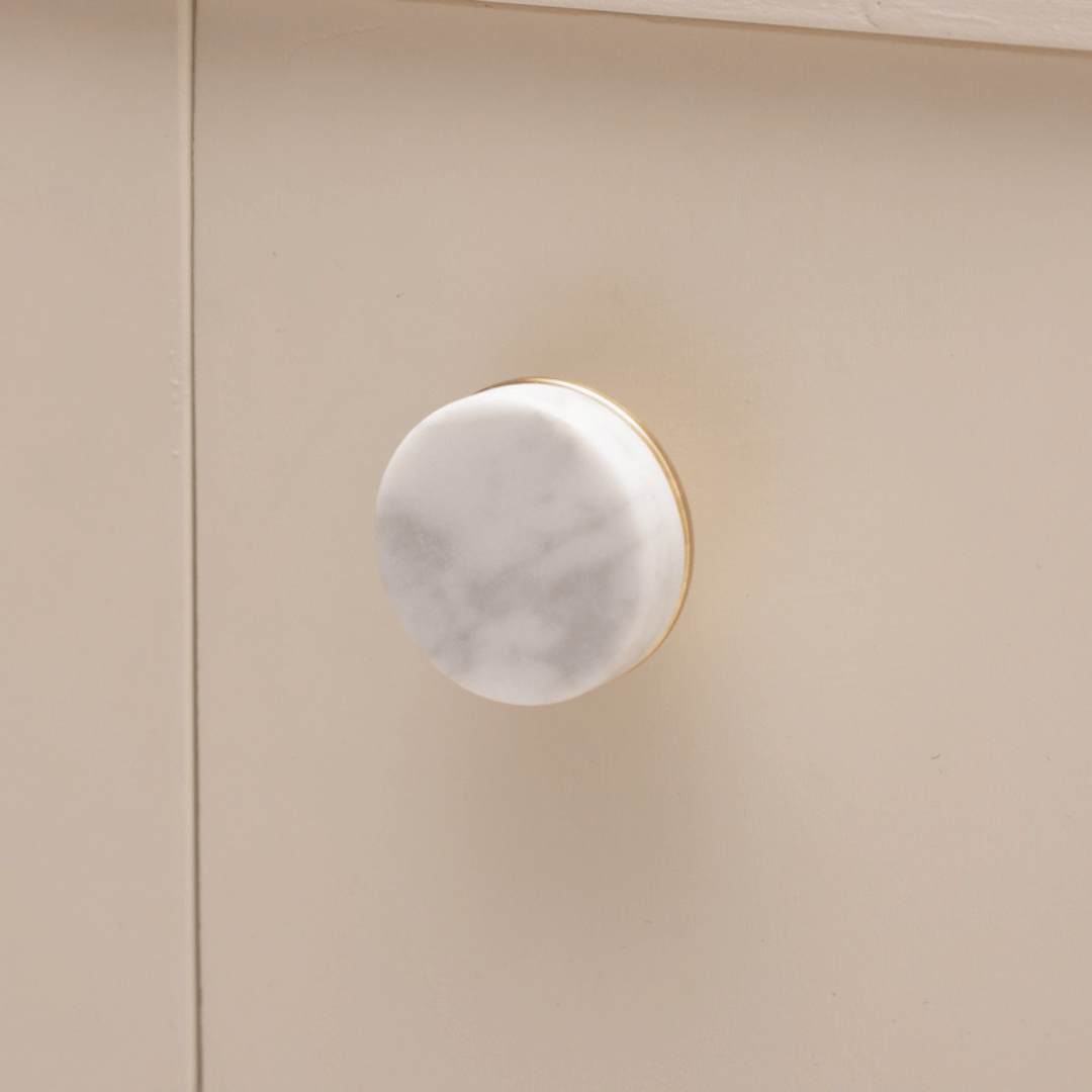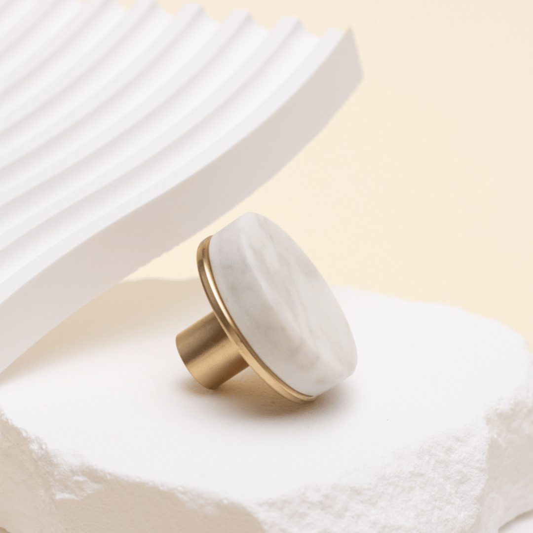 Paris knott i messing og hvit marmor. Denne nydelige knotten har et moderne og luksuriøst design. Perfekt til kommoden, skuffer og skap, kjøkkenet eller baderomsinnredningen.