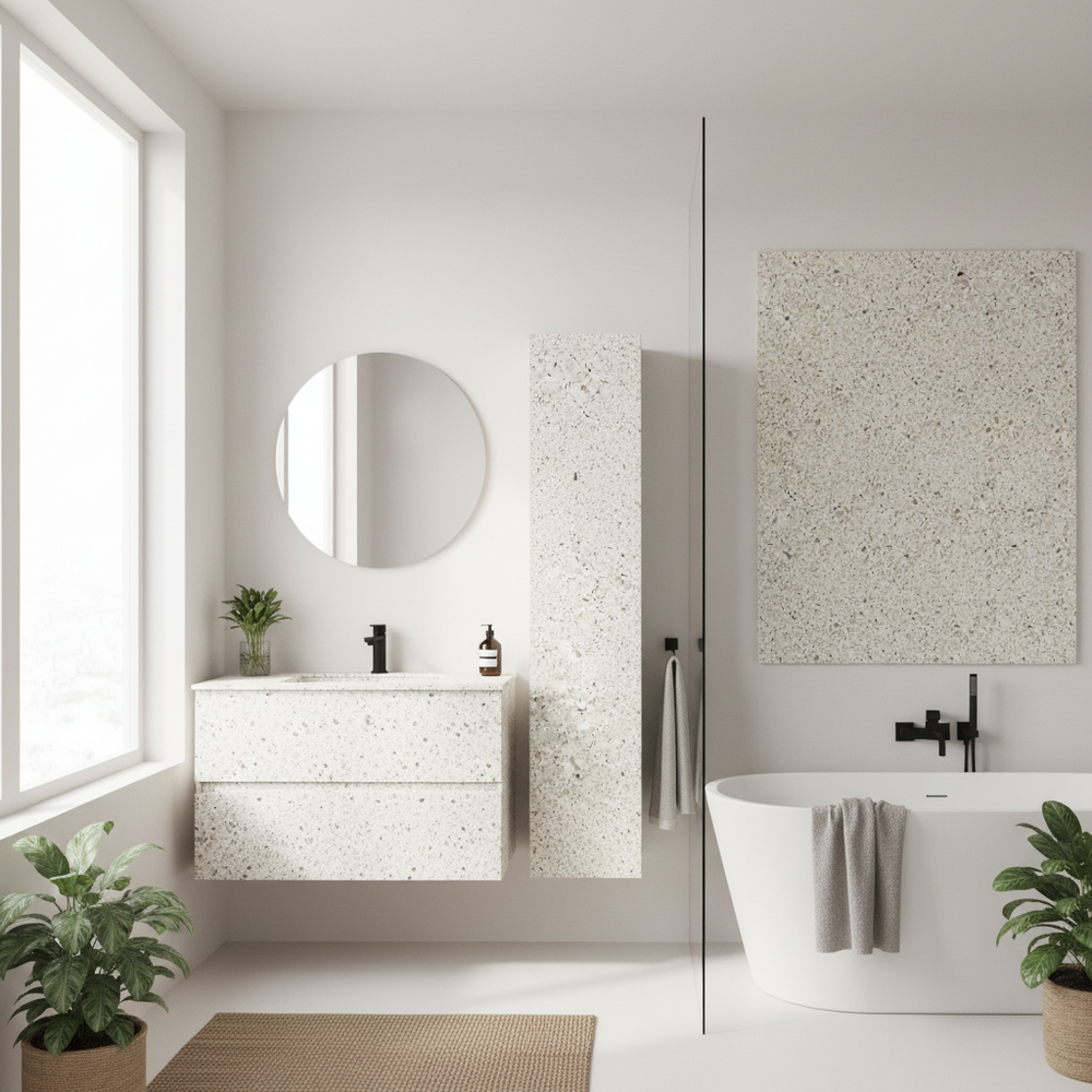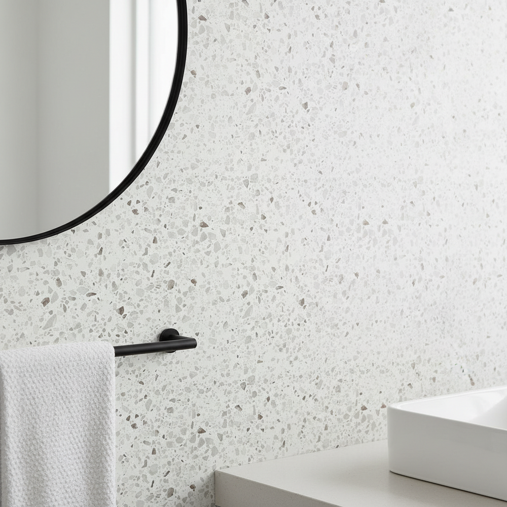 Tykkere, premium kontaktplast med selvklebende bakside og elegant granittmønster. Den sofistikerte overflaten i dempet beige og bruntoner på lys bakgrunn gir et naturlig steinuttrykk som passer perfekt til moderne interiør.