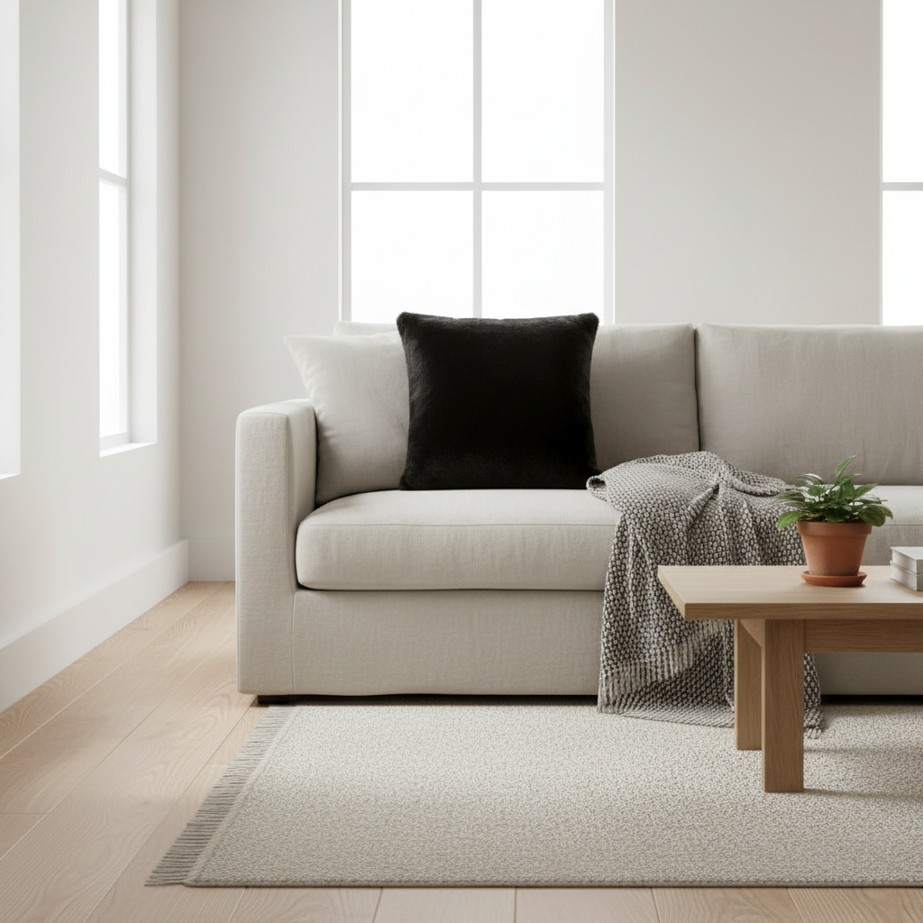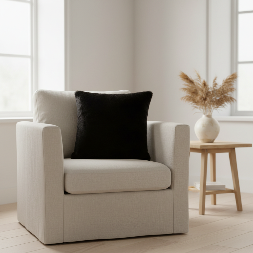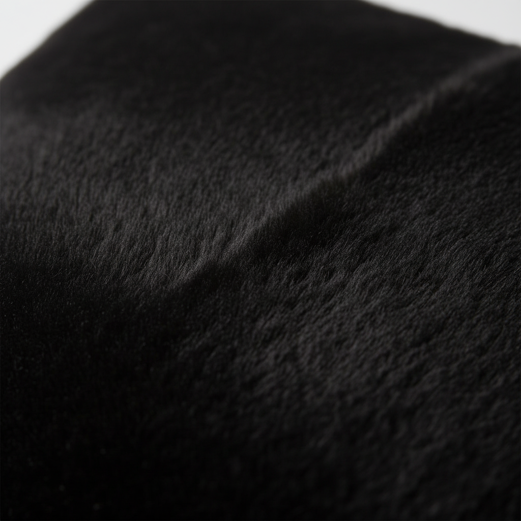 Sort kunstpels med myk og tett overflate. Den dype sorte fargen skaper kontrast og eleganse i interiøret.