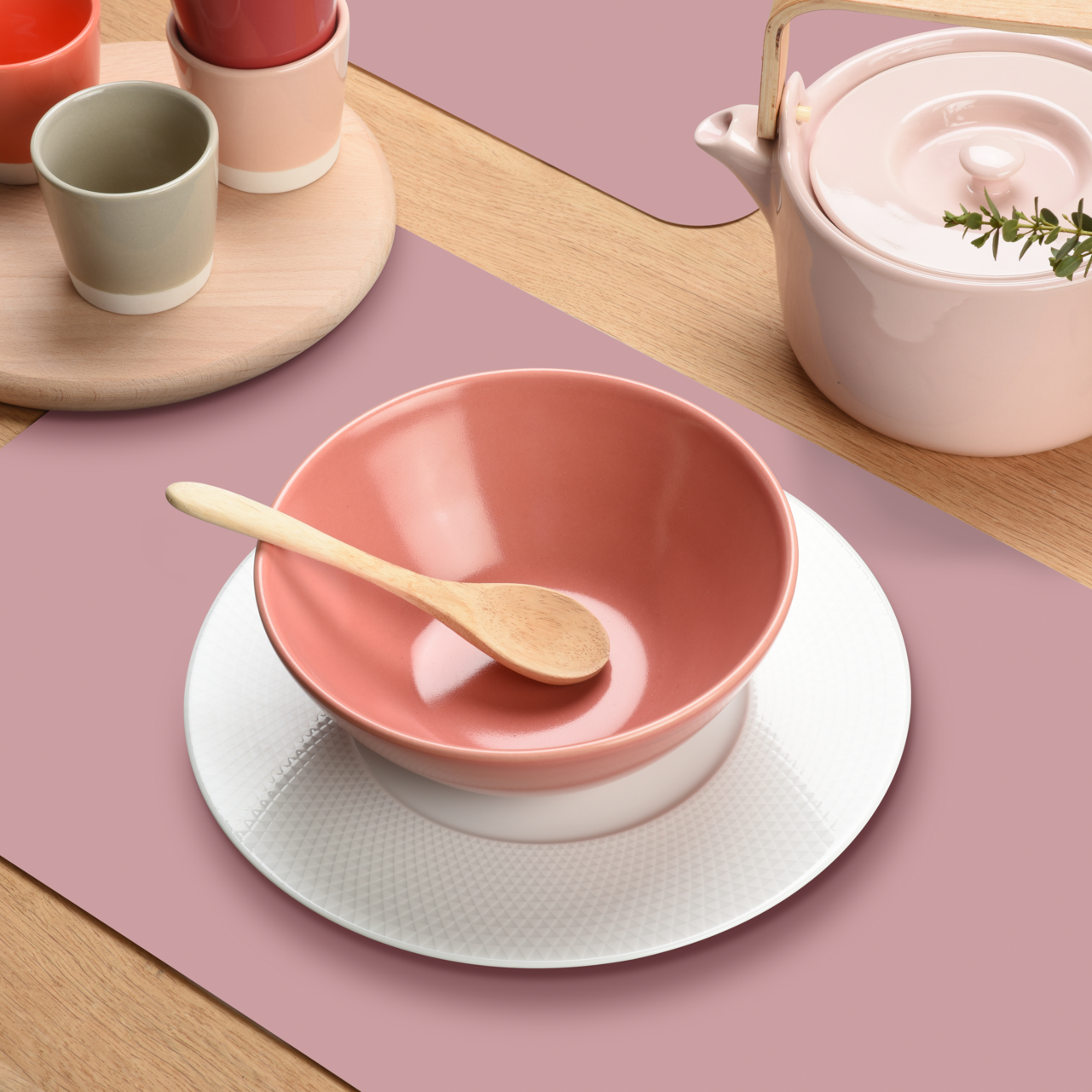 Den varme rosafargen er lett å kombinere med serviser i både lyse og mørke toner og passer like godt på kjøkkenet som i spisestuen.