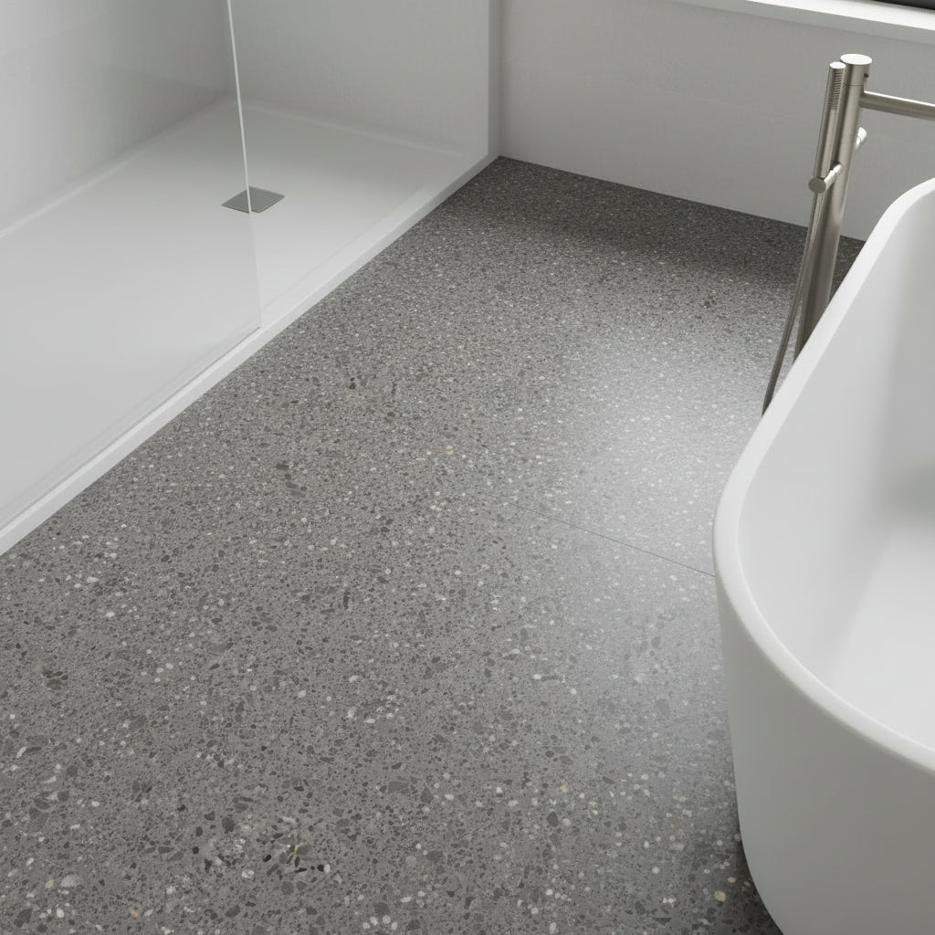 Den mørkegrå basen gjør flisene godt egnet i rom der du ønsker en mer markert og moderne overflate, for eksempel på baderomsgulv, i dusjsoner, gang eller vaskerom. Terrazzo-mønsteret bidrar samtidig til å skjule små merker og vannsprut i daglig bruk.