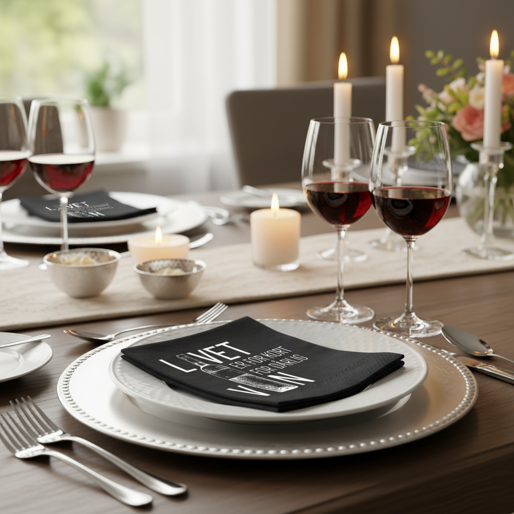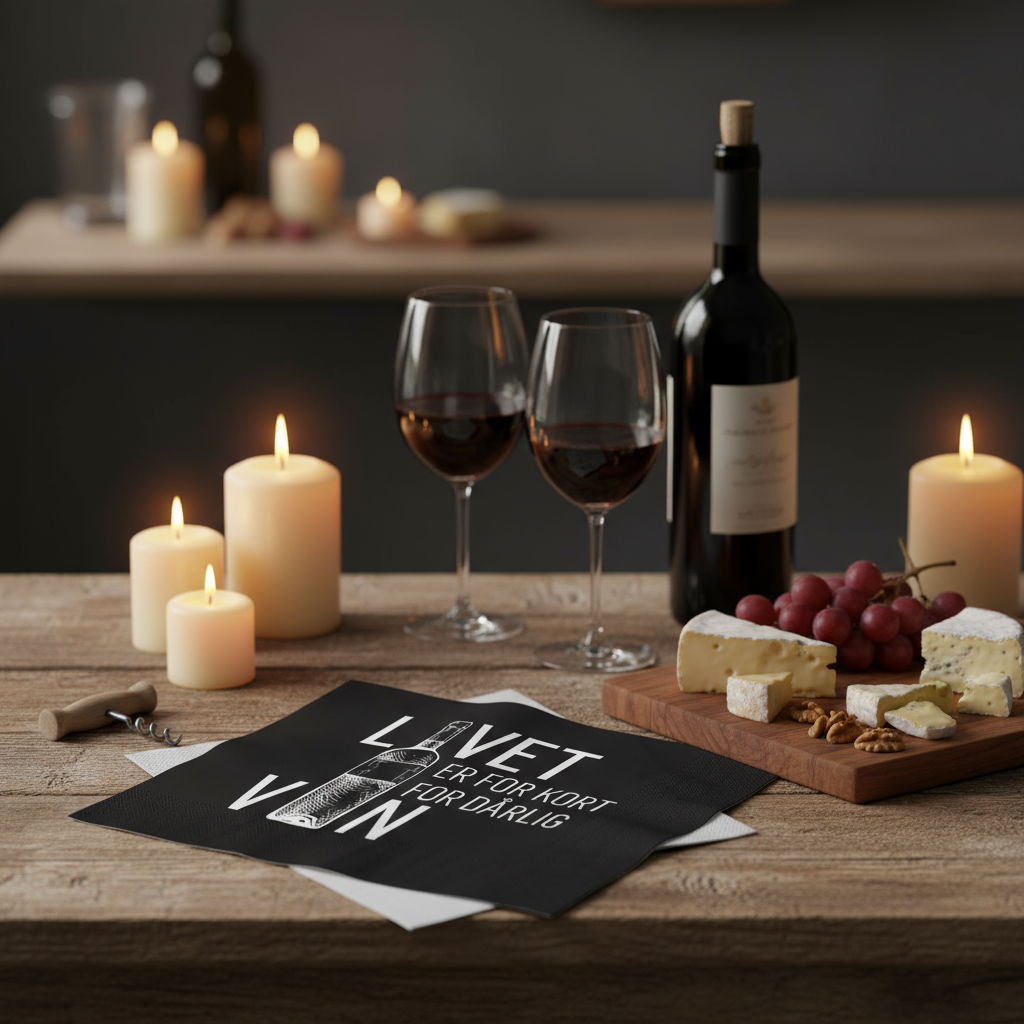 Legg til litt humor og stil på bordet med disse serviettene med teksten «Livet er for kort for dårlig vin». Perfekte til vinkvelder, tapas, bursdager eller middager med venner.