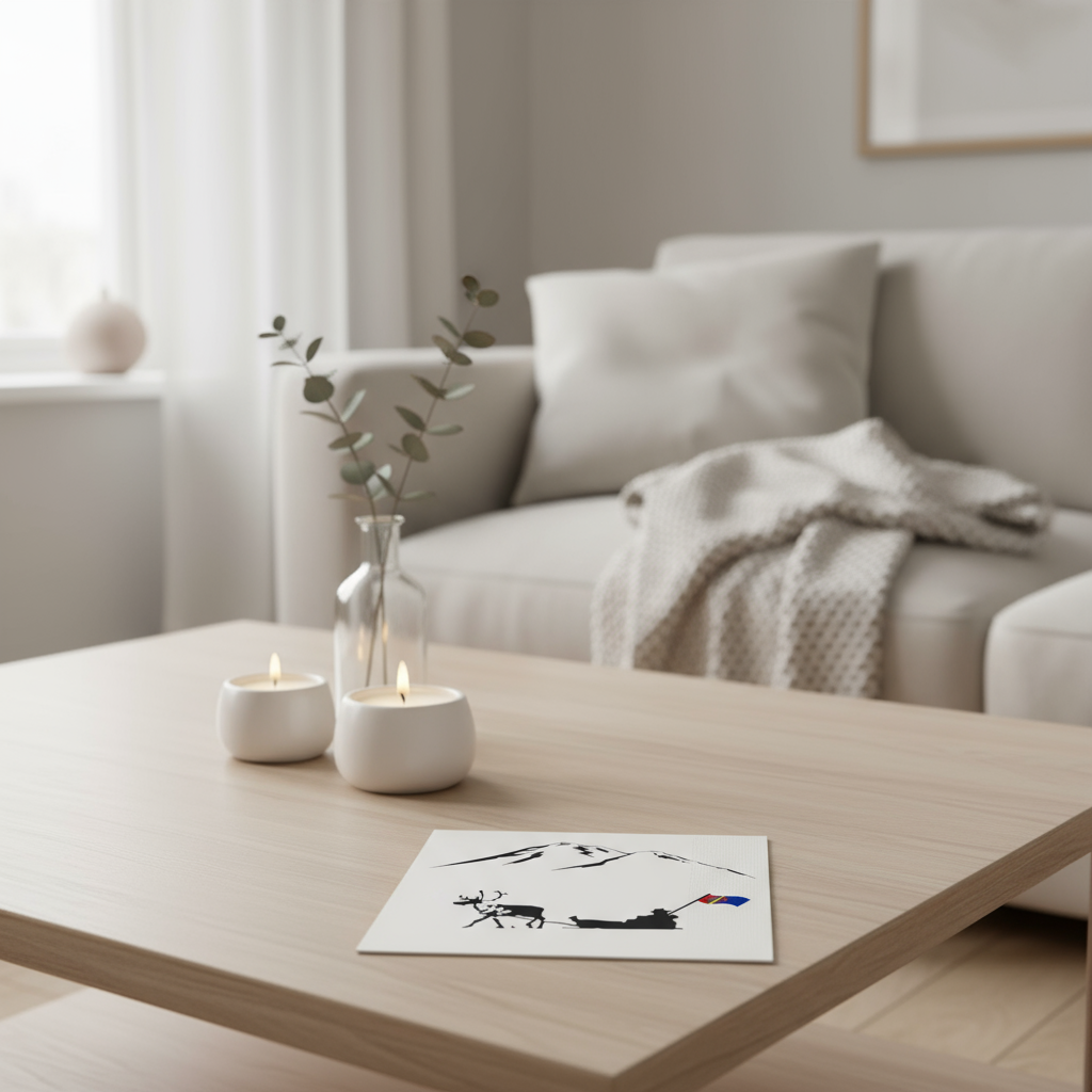 Dekorative servietter med vakkert motiv av slede og reinsdyr i naturskjønt landskap, med sameflagget som fargerik detalj. Et stemningsfullt innslag på bordet til høytider, feiringer og hyggelige sammenkomster.