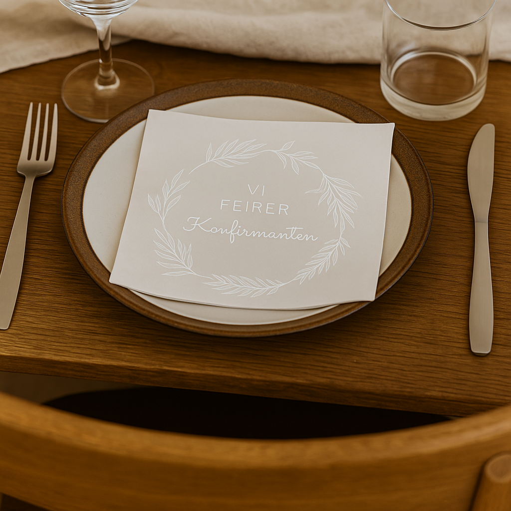 Nydelige trelags servietter i beige med tekst. Passende til konfirmasjon.