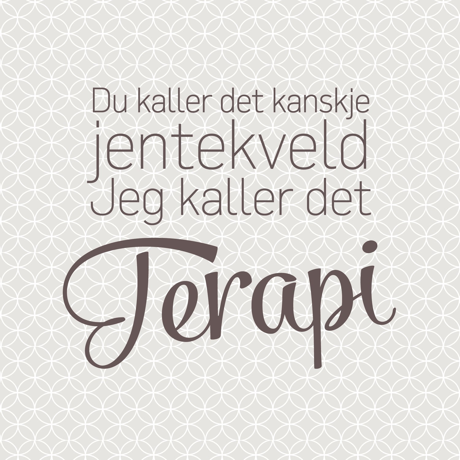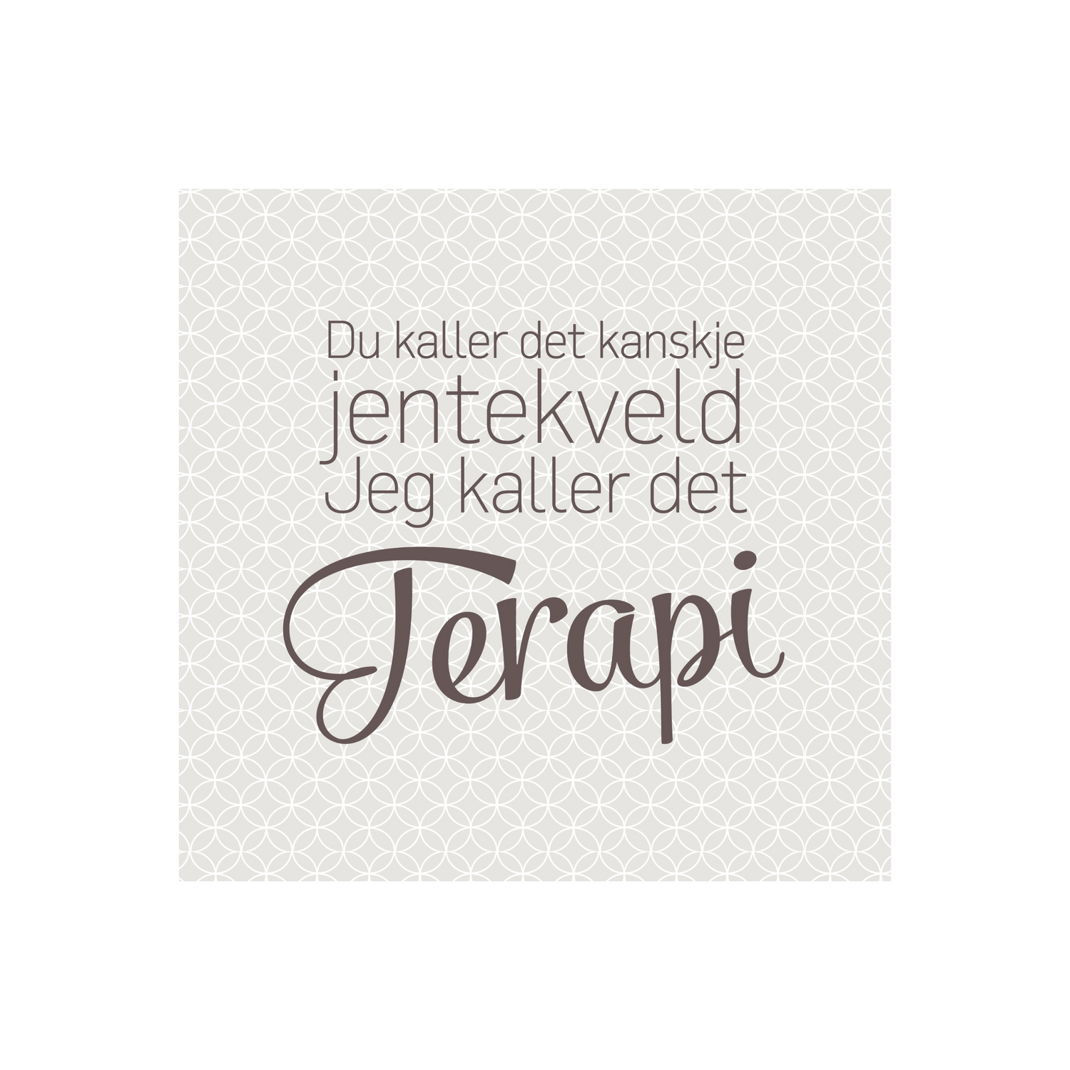 Stilfulle, beige servietter med teksten "Du kaller det kanskje for jentekveld. Jeg kaller det Terapi" i hvit.