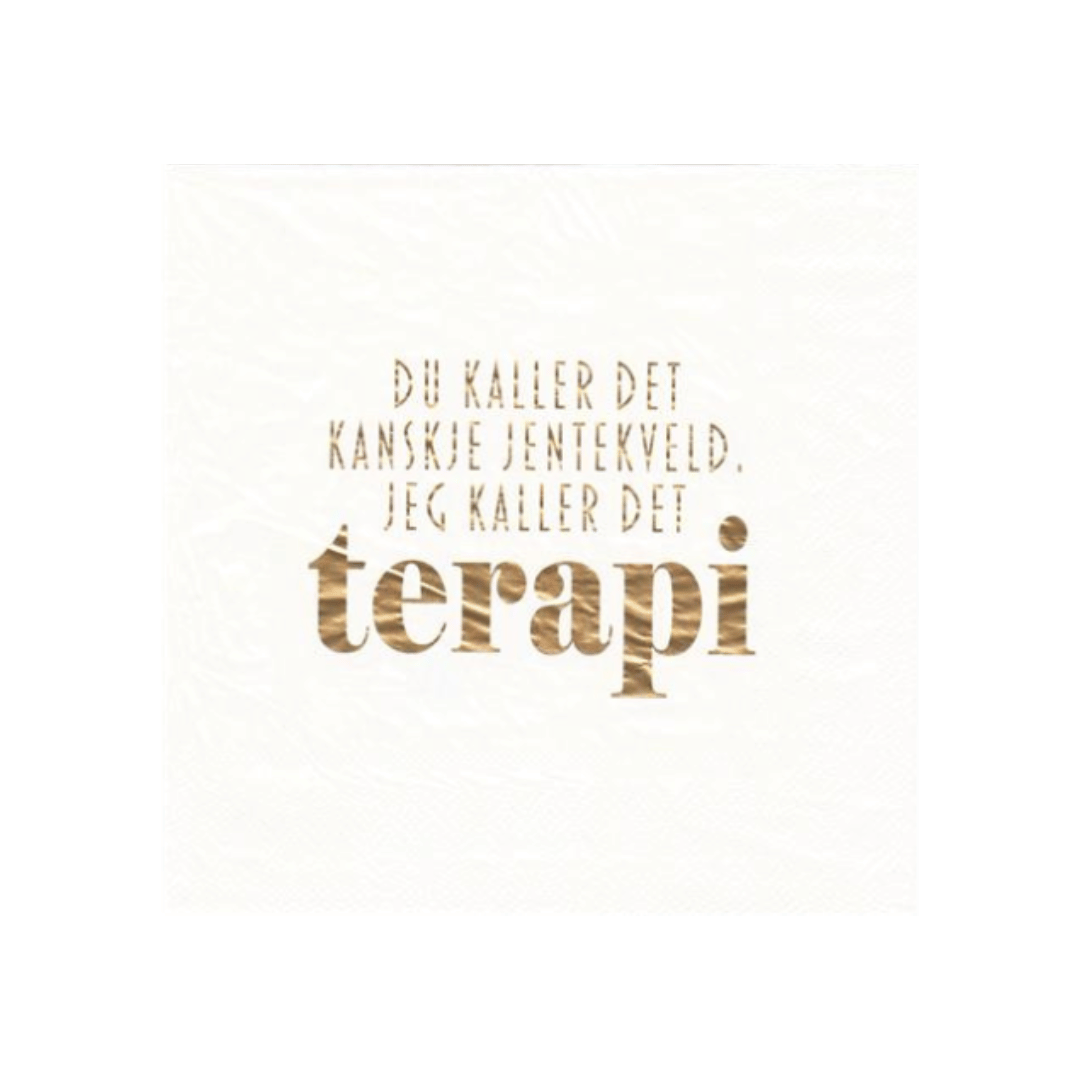 Stilfulle, hvit servietter med teksten "Du kaller det kanskje jentekveld, jeg kaller det terapi" i gull. Serviettene er laget av 3-lagspapir og kommer i en pakke med 20 stk servietter.