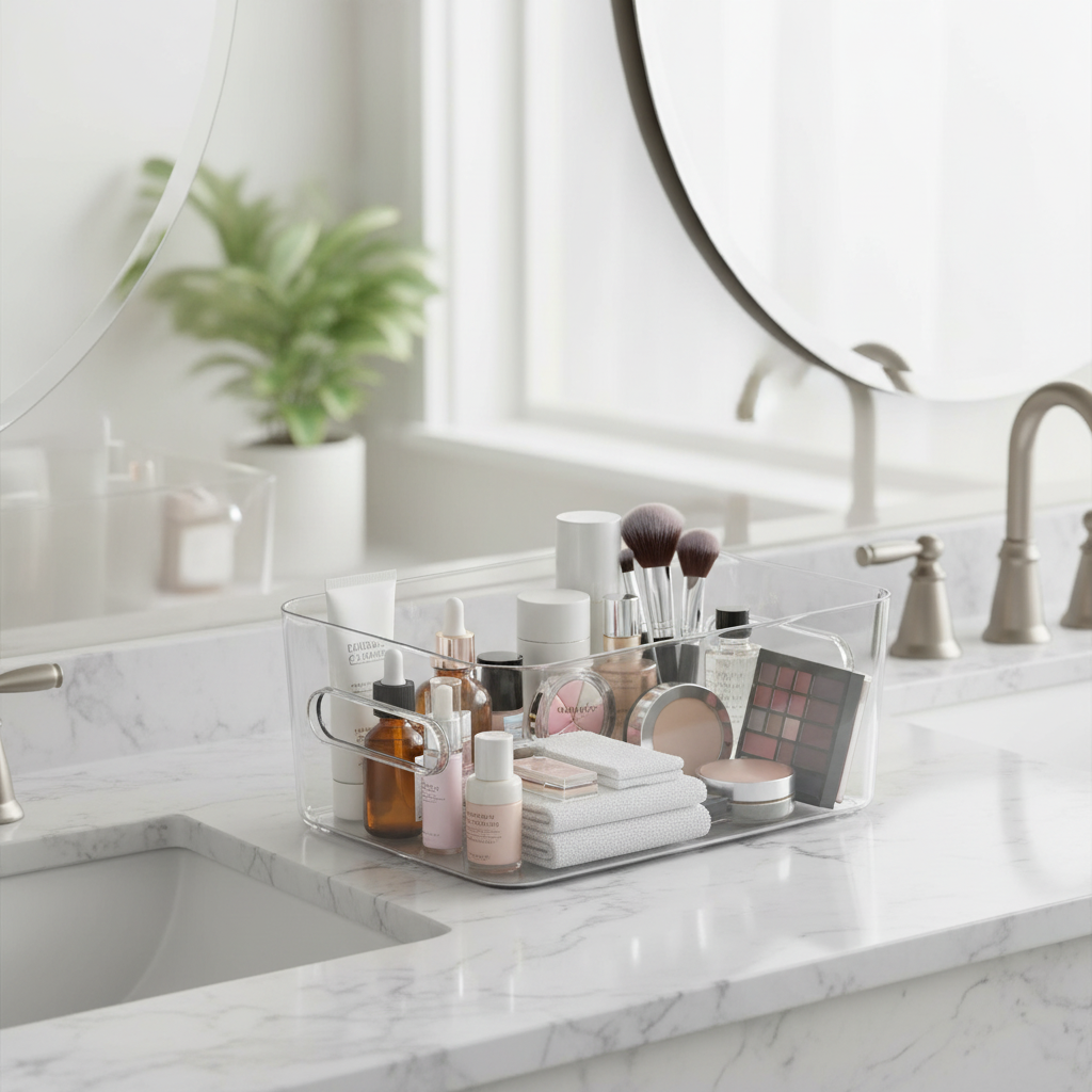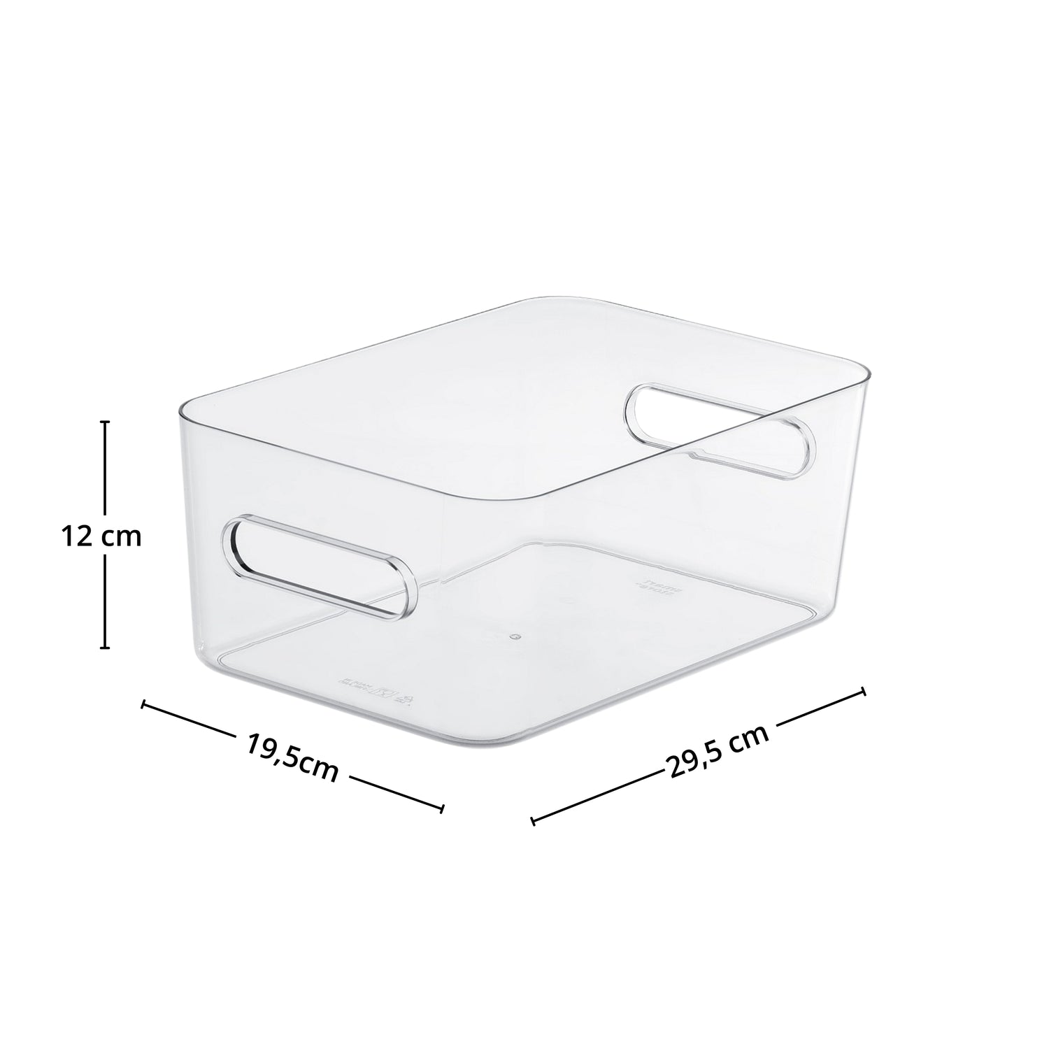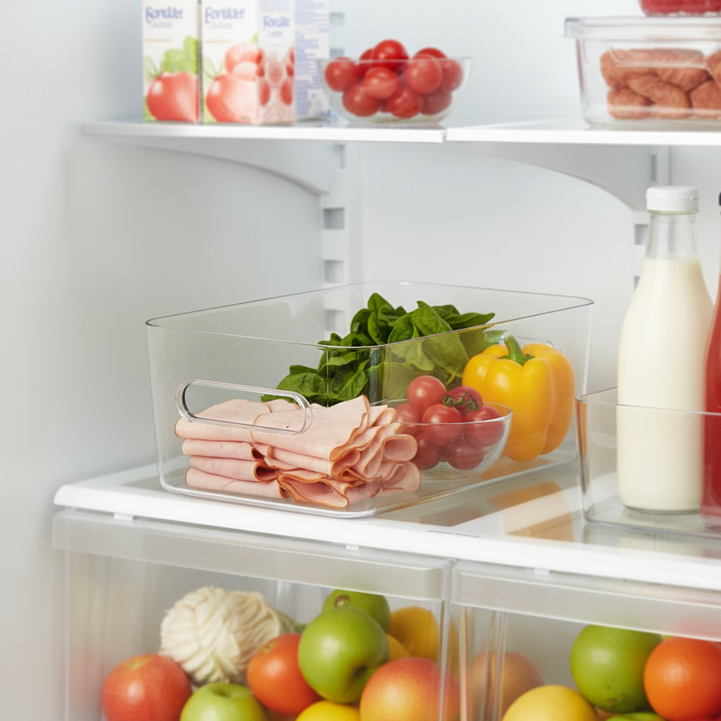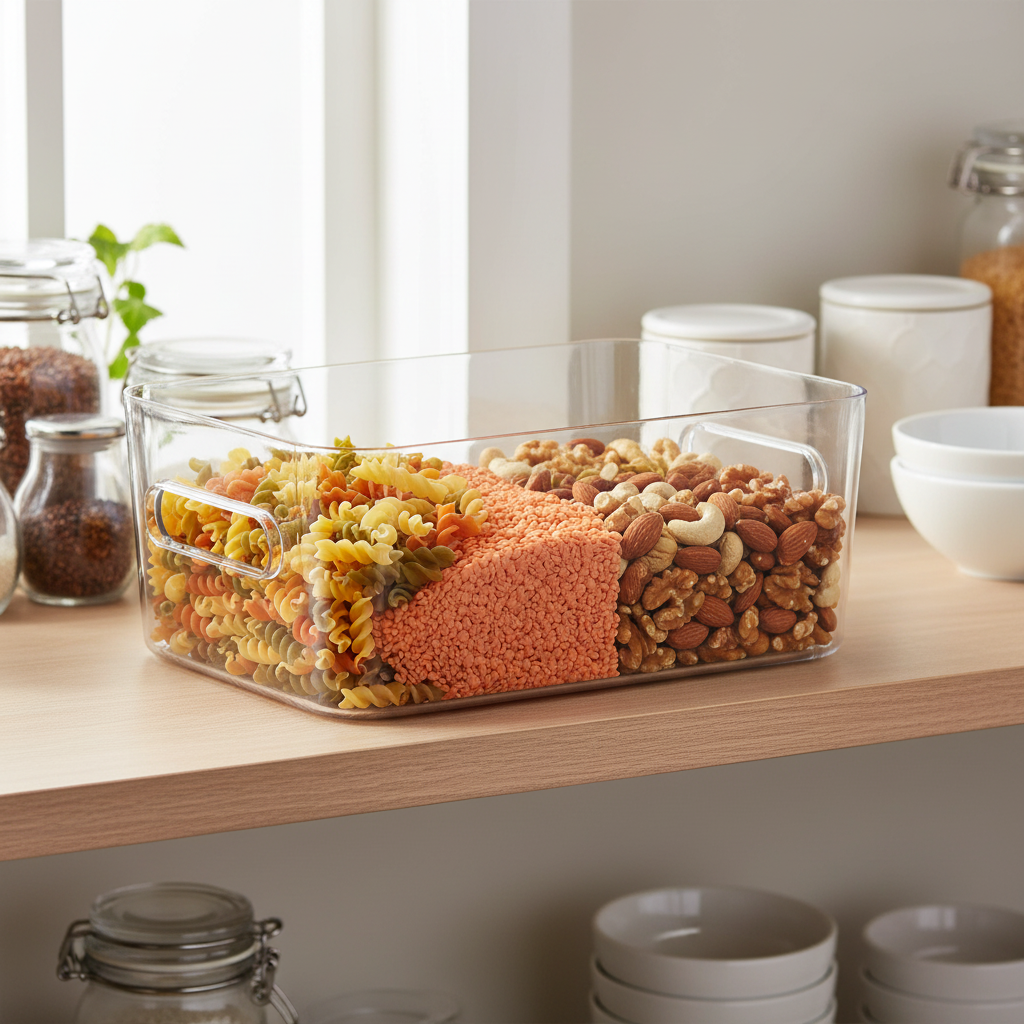 Den praktiske størrelsen passer perfekt til organisering av alt fra matvarer og kjøkkenutstyr til toalettsaker, rengjøringsartikler og småting i hjemmet. Integrerte håndtak gjør boksen enkel å løfte, trekke ut og flytte, noe som er spesielt praktisk i dype skap eller på hyller.